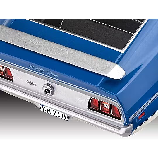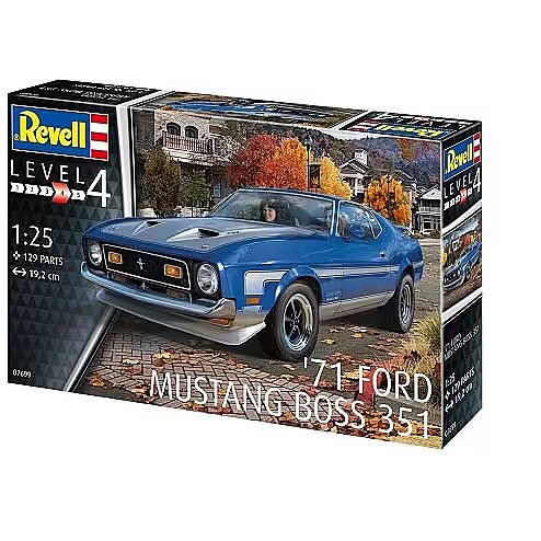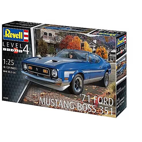 Description - Car 71 Ford Mustang Boss 351 1/25 The 1971 Mustang Boss 351, known as one of the most legendary muscle cars, impresses with its powerful 5.8-liter Cleveland engine. The Revell plastic model kit does not include paints or glue.