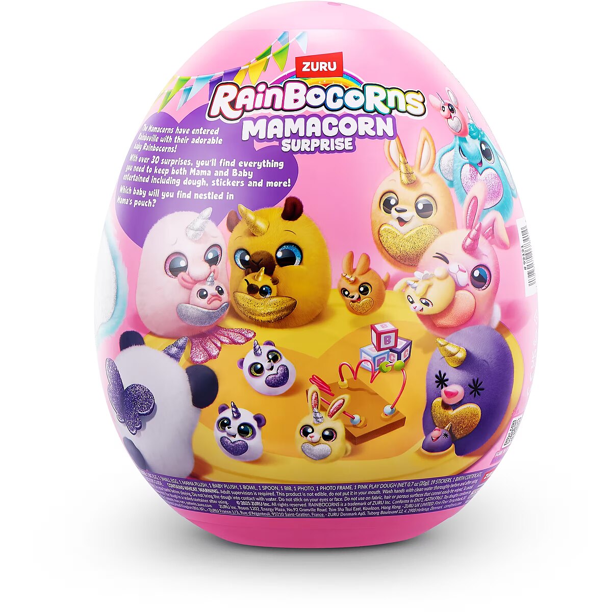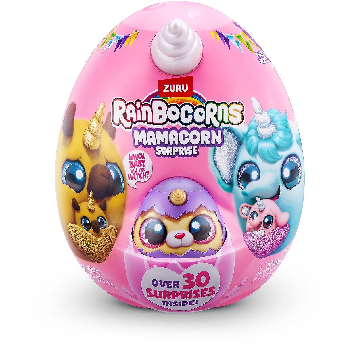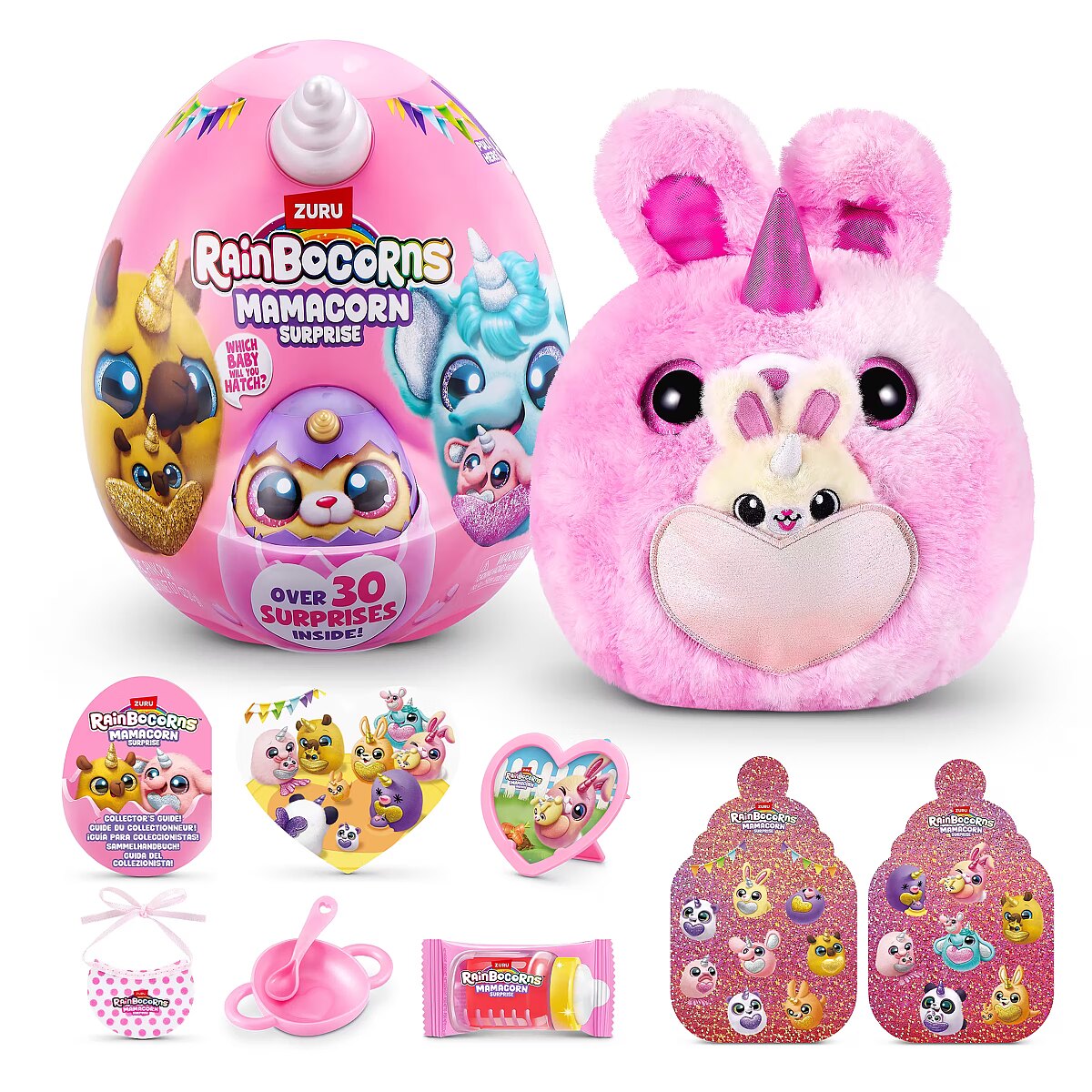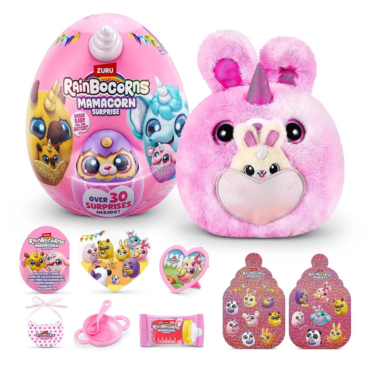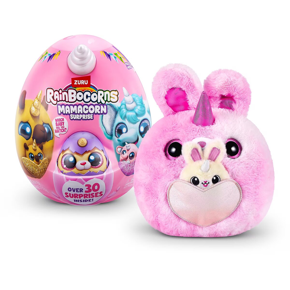 LongDesc - Rainboville has a new mom! Meet Rainbocorns Mamacorn Surprise, a magical new addition to the Rainbocorns family! Hatch the colorful egg and uncover over 30 exciting surprises. Inside, you’ll find one of seven adorable Mamacorn plushes, along with a mystery baby to discover. Which one will you hatch? The excitement awaits! Crack open the egg to meet your new favorite plush, Mamacorn! Each Rainbocorns Mamacorn Surprise is filled with charm and ready to bring magic to your collection. Uncover a mystery baby Rainbocorn and add even more enchantment to your world. With over 30 surprises inside, including fun accessories, mini surprises, and a magic heart to reveal, Mamacorn is sure to delight. Collect all 7 Mamacorns to expand your magical realm and discover the magic of Rainboville!