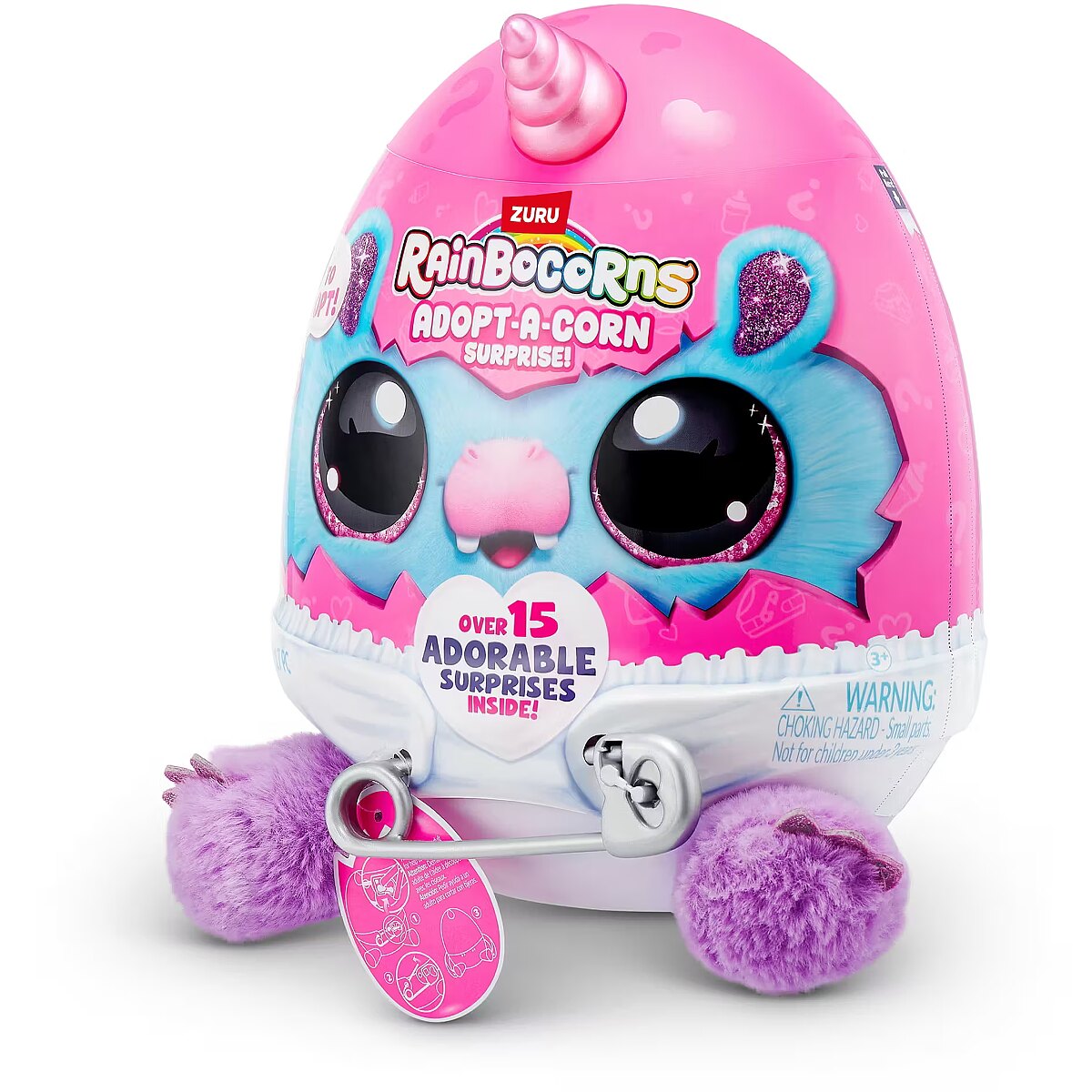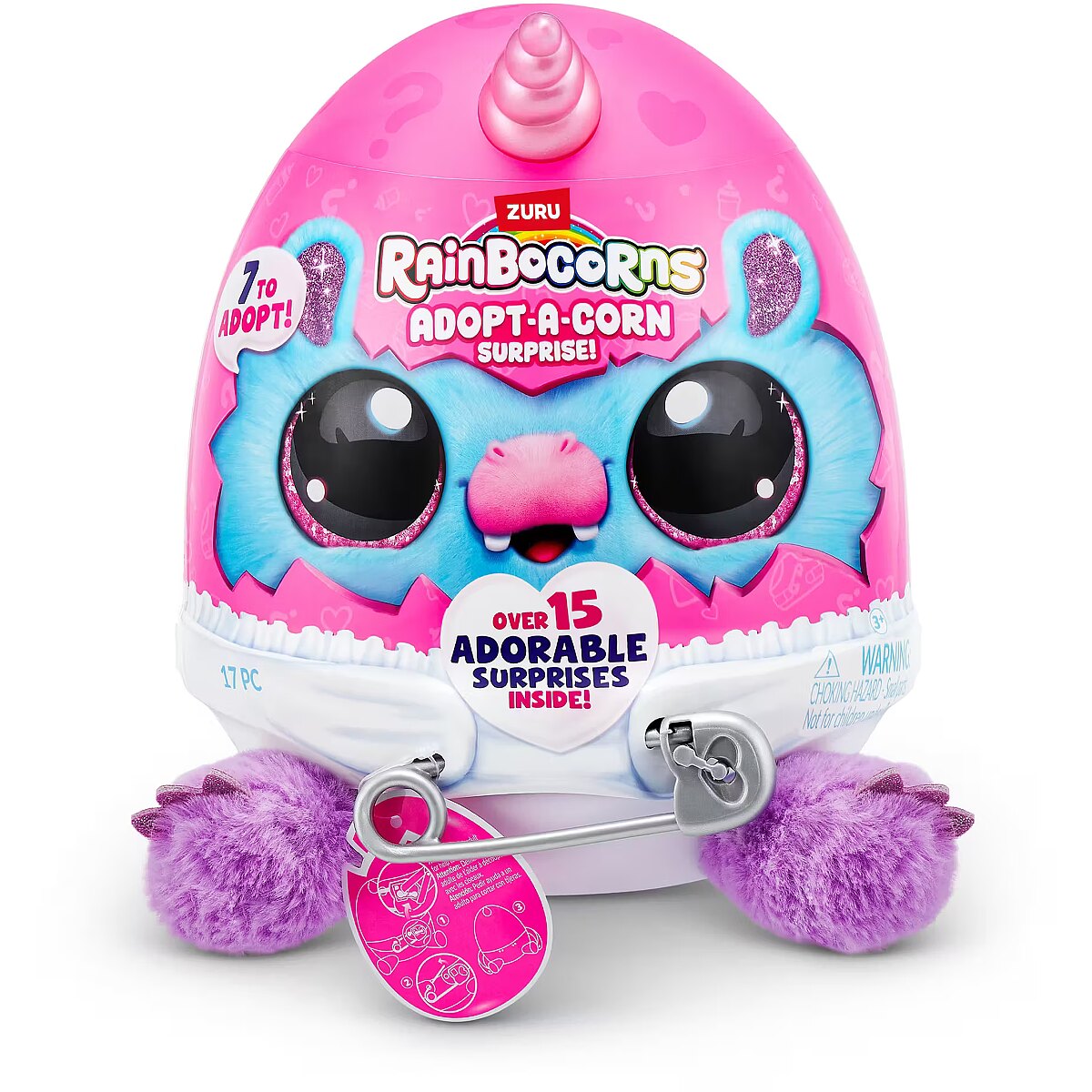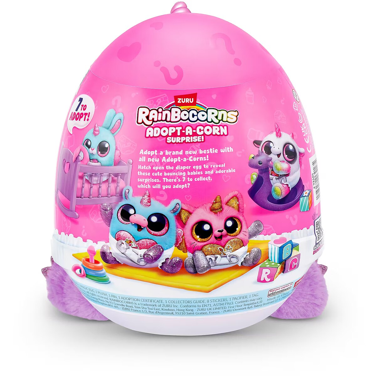 LongDesc - Rainbocorns Adopt-A-Corn Surprise ZURUAdopt a brand new bestie with all-new Adopt-A-Corns! The cutest little baby Rainbocorns are crawling around Rainboville and are in need for your love and care! Unclip your Adopt-A-Corn out of its diaper for adventurous fun and clip back once it's time for some rest. Don't forget about the pacifier! There are 7 Adopt-A-Corns to adopt. Each egg comes with over 15 adorable surprises inside!