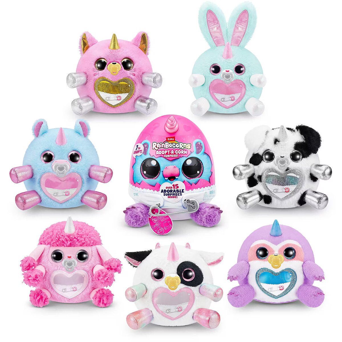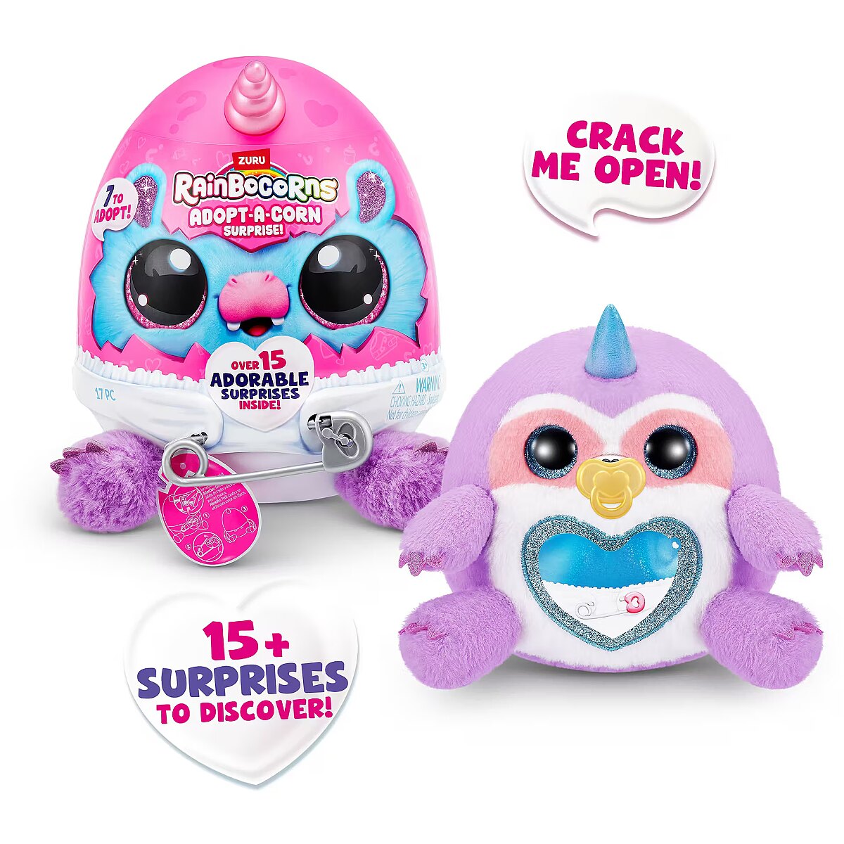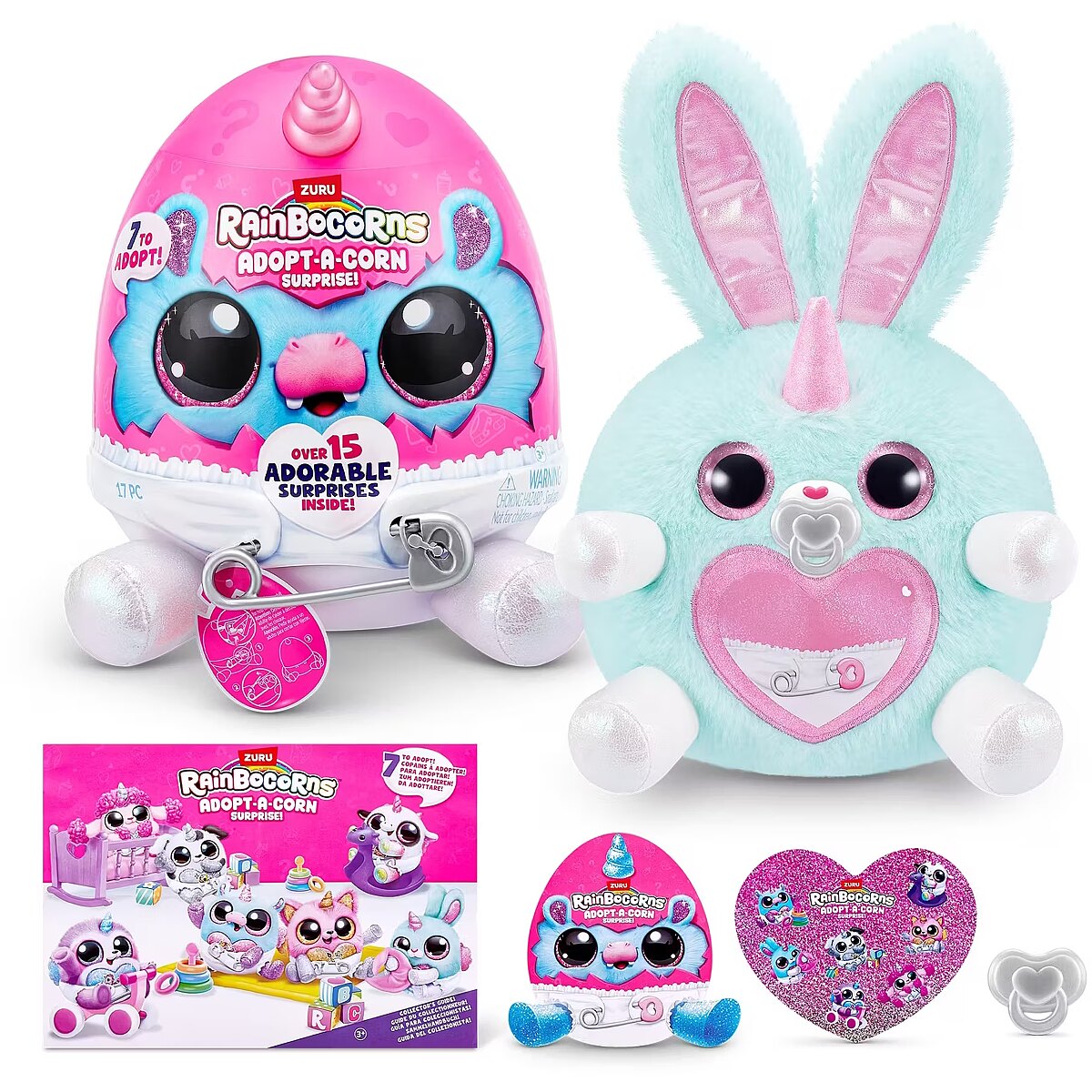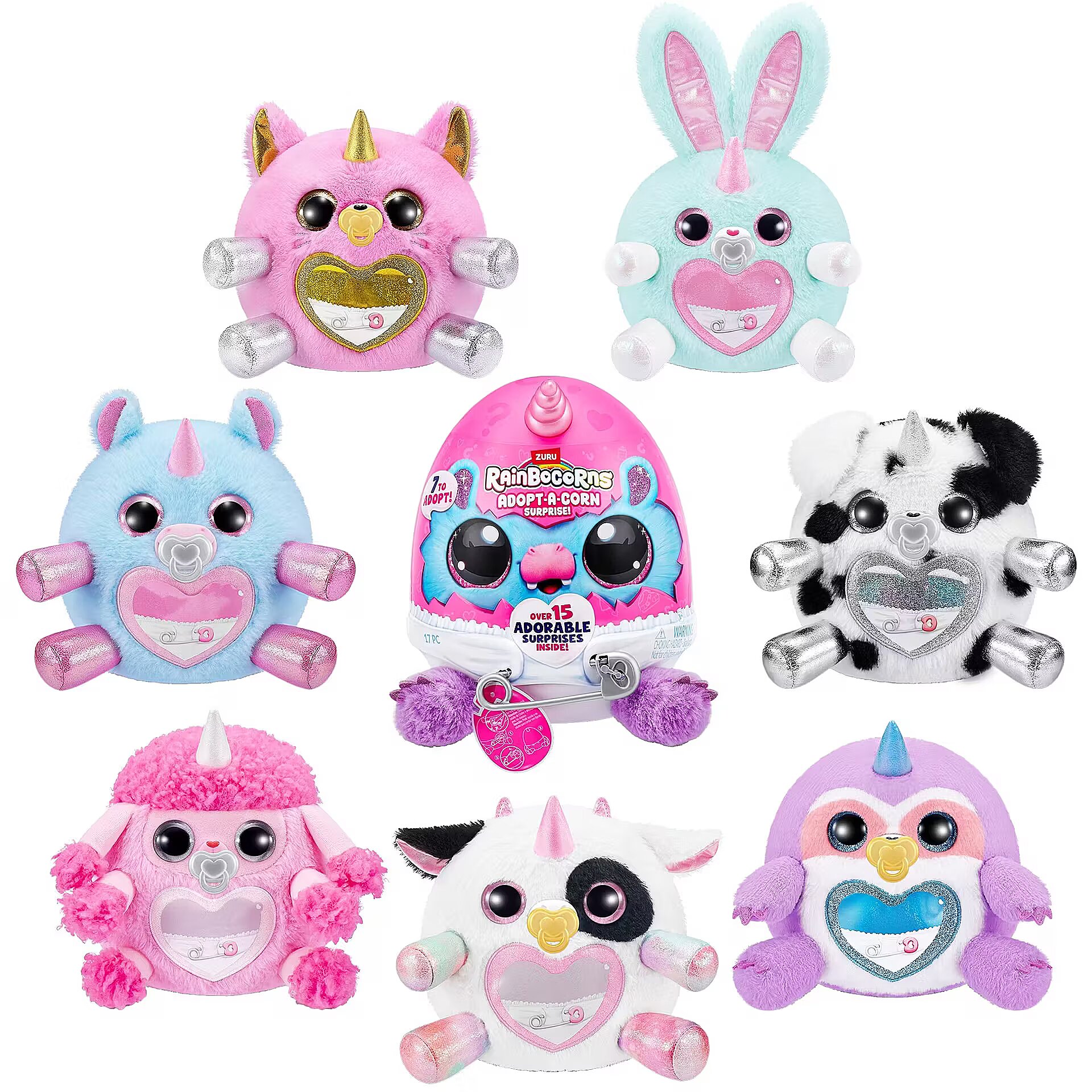 LongDesc - Rainbocorns Adopt-A-Corn Surprise ZURUAdopt a brand new bestie with all-new Adopt-A-Corns! The cutest little baby Rainbocorns are crawling around Rainboville and are in need for your love and care! Unclip your Adopt-A-Corn out of its diaper for adventurous fun and clip back once it's time for some rest. Don't forget about the pacifier! There are 7 Adopt-A-Corns to adopt. Each egg comes with over 15 adorable surprises inside!