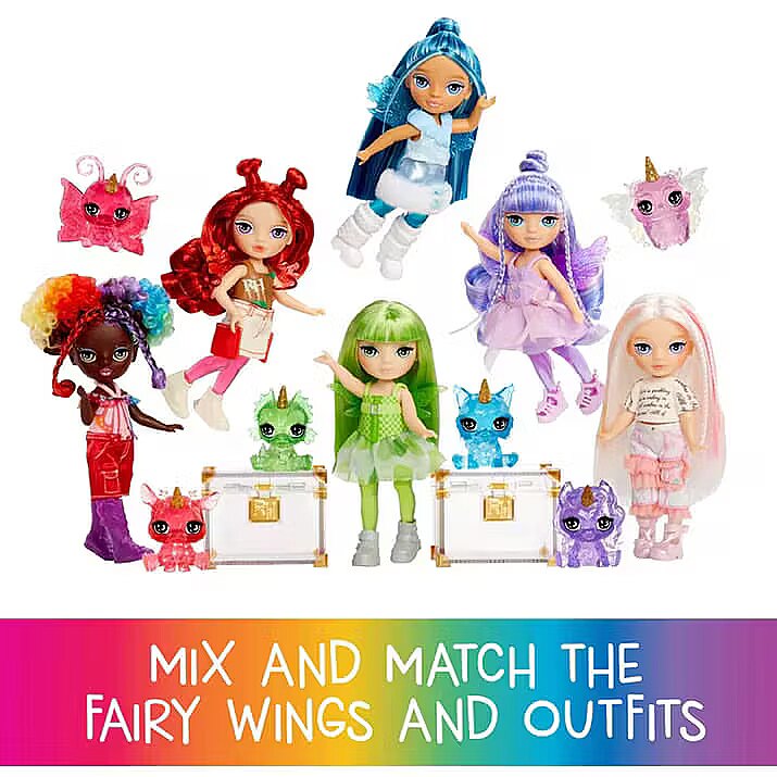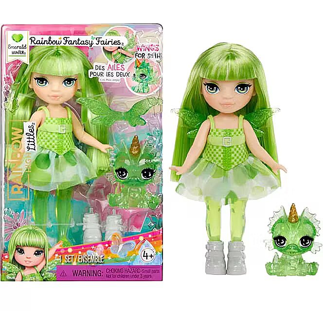 LongDesc - Rainbow High Littles are stepping into a magical world alongside their big sisters—and now, they have wings! These adorable Littles feature interchangeable fantasy fairy wings that can also be swapped with their enchanted pets. Each 5.5” poseable doll comes with a removable outfit, stylish shoes, brushable hair, and mesmerizing clear legs._Collect the rainbow: Astrid dazzles in rainbow with her Butterfly, Apple shines in red with her Deer, Emerald sparkles in green with her Dragon, Sapphire stuns in blue with her Dog, and Opal enchants in rainbow with her Owl.
