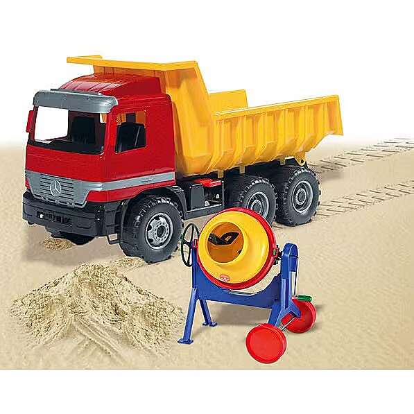 Description - Super tipper Mercedes Giants Dump Truck, ACTROS model, triaxial, red cab, black chassis and yellow trailer. Made of high quality materials that meet European standards. The vehicle has a trailer lock so the child can safely sit on it. This functional dump truck is 63 cm long and can withstand loads up to 150kg.