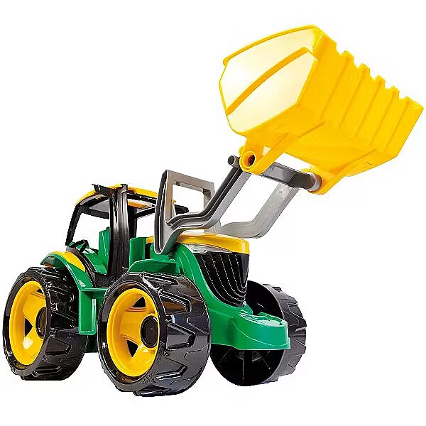Description - Ciągnik z łyżką do ładowania. Wykonany z wysokiej jakości plastiku, spełniającego normy Europejskie. Pojazd posiada 2 mniejsze koła z przodu i dwa większe z tyłu. Pojazd ma podnoszone ramię z przodu z ruchomą łyżką ładującą. Długość 62 cm. Zabawka wytrzymuje ciężar do 100 kg.
