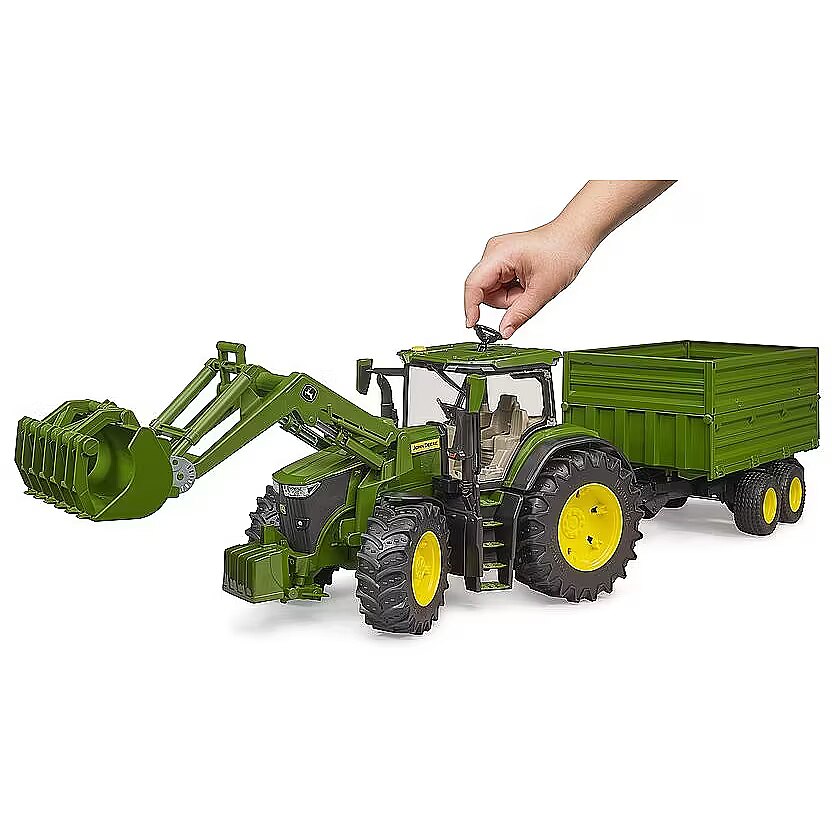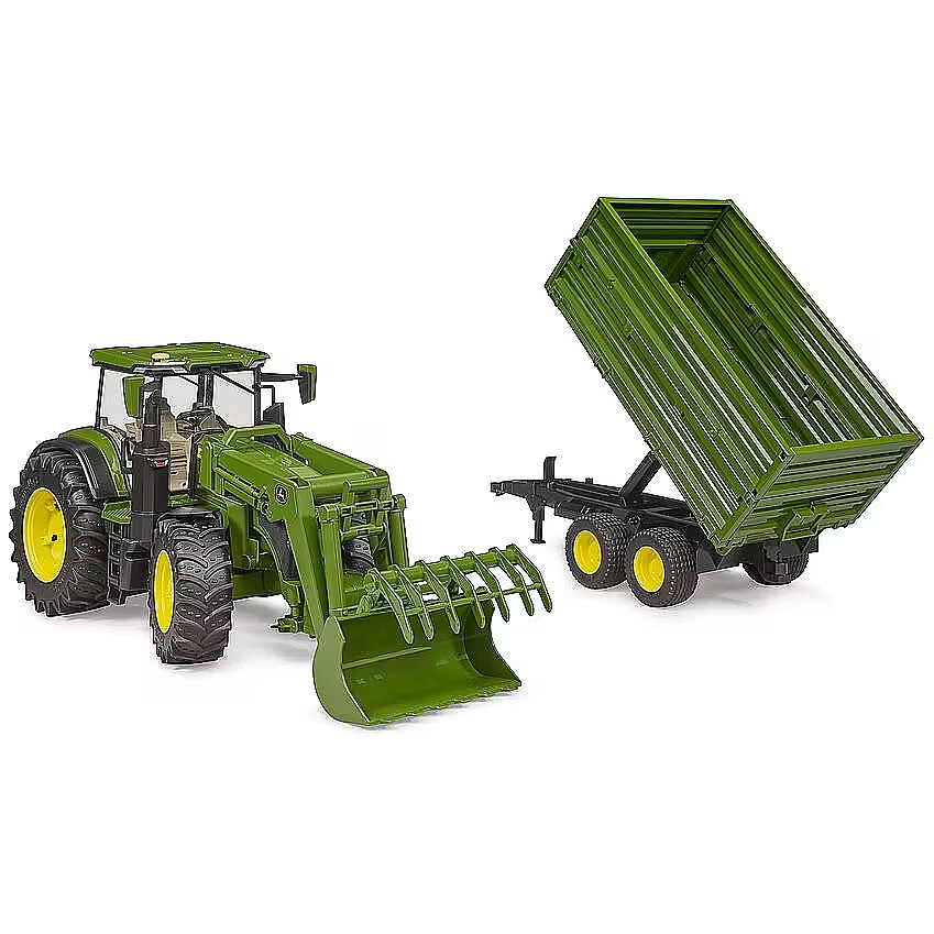 Description - John Deere 7R 350 tractor with loader and trailer An excellent educational toy whose main features are: Extended steering wheel for easy manoeuvring Soft rubber tyres with tread Opening bonnet Opening cab doors Off-road suspension system Standard front and rear hitch Removable counterweight Functional front loader Trailer with raised sides Compatible with bWorld figures and many Profi-series agricultural machines and trailers Features typical Bruder toy qualities: Top quality workmanship Perfect reproduction Functionality
