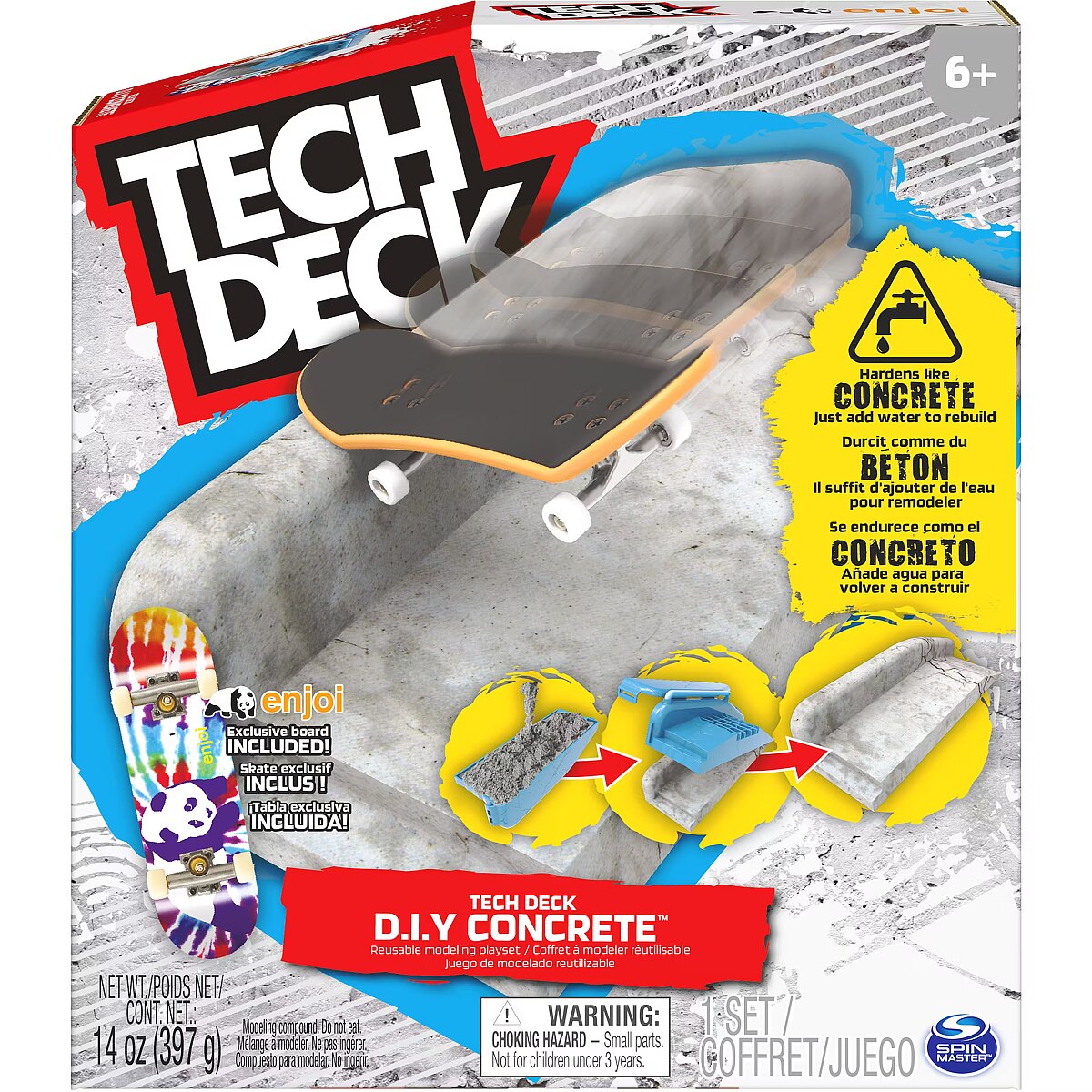 LongDesc - Build your own fingerboard obstacle course with the Tech Deck DIY Concrete Reusable Modeling skatepark! This set comes with everything you need to create your own skateboard ramps and rails, including 14oz of reusable concrete compound, ramp and rail molds, a molding tool, and an exclusive Enjoi Fingerboard! The DIY concrete is easy to use and reuse, great to use with mini skateboards for kids. Wet it, set it, and shred it! Simply add water, let it sit for 6-8 hours, and your creation will harden just like concrete. Use the molds to create perfect fingerboard ramps or create your own fingerboard skatepark to level up your skill. Simply add water to create new challenges. Challenge your friends, develop your skills, and build your Tech Deck collection with other toy figures & playsets. Tech Deck fingerboards are for skate-lovers ages 6 and up who love small toys. Create your own obstacles with the Tech Deck DIY Concrete Reusable Modeling Playset! Tech Deck mini skateboards for fingers and ramp sets make the perfect gift for girls toys age 6-8 who love small toys and cool toys or as an alternative to toy cars as a boys toys age 6-8 item. If you want real skate graphics from real skate companies, then it has got to be Tech Deck — start small, go big and collect them all!Includes: 1 outer mold, 1 rail, 1 compound bag, 1 tech deck, 1 sticker sheet, 1 molding tool, 1 instruction sheet