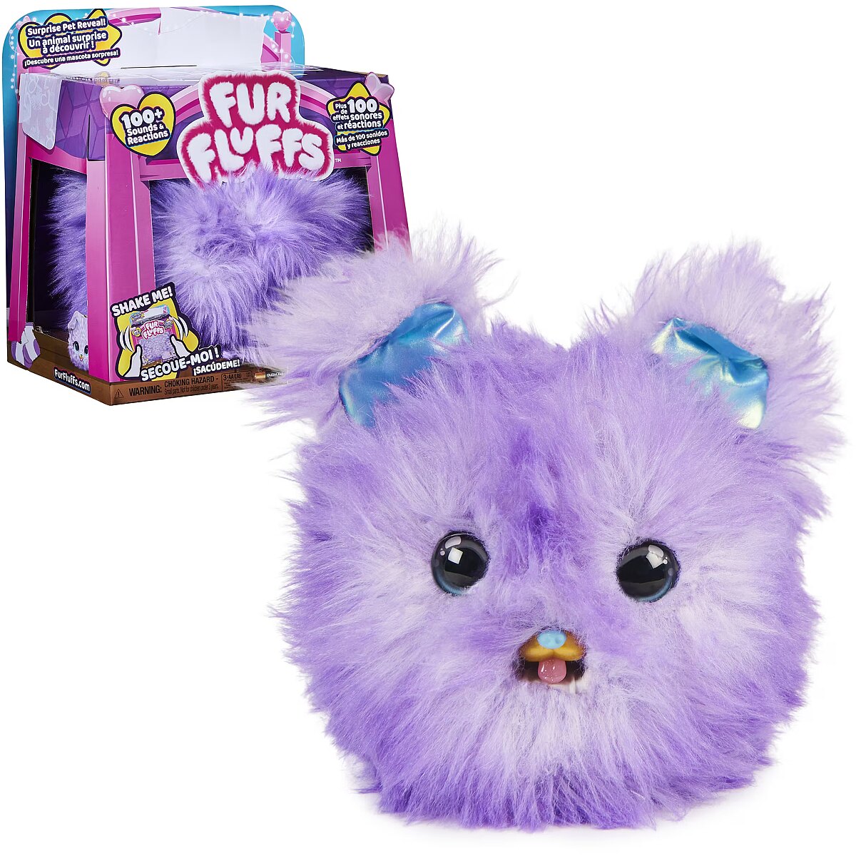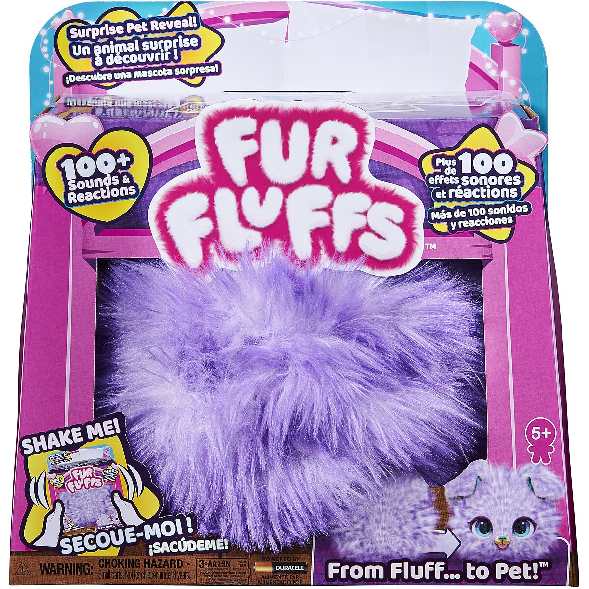 LongDesc - Introducing Fur Fluffs: fluffy interactive pets looking for their fluff-ever home! These super cute toys for kids feature over 100 exciting sounds and reactions and have a surprise pet reveal! Hidden inside a soft purple fluff is Pupper-Fluff. Play with your shy and timid Fur Fluffs toy to encourage her out of hiding and earn her trust. You can pet, roll, shake, toss and turn her upside down – when your fluff is feeling more comfortable, she reveals her ears! Keep playing, and her eyes will peek out, too! Once Pupper-Fluff fully trusts you, you’ll hear the celebration song and she’ll transform from fluff to pet! As you play, you’ll unlock Pupper-Fluff’s sweet and silly personality. With so many sound effects and reactions, you never know what adorable response you’ll get! This little fluff loves to eat, roll, snuggle, dance, sing and more. There are so many ways to play in both fluff and pet mode! She purrs and coos when pet, giggles and wiggles when tickled and gets dizzy if shaken. Toss your new friend in the air or turn her upside down to see her somersault! In fluff mode, feed her and scare away hiccups, play a game and more. You can even have a dance party with your Fur Fluffs! Tilt your pet left and right to play music and touch Pupper-Fluff’s head to hear her sing. Shake, toss and tilt your pet for even more music sounds, like a cute high note! At any time, transform your Fur Fluffs pet back to fluff, or change from fluff to pet again and again. For more fluffy fun, look for Fur Fluffs Purr ‘n Fluff (sold separately)! Fur Fluffs toys are perfect for pretend play and make great birthday gifts, Christmas gifts or gifts for kids aged 5 and up for any occasion. Each Fur Fluffs measures approximately 7 in. in diameter. Includes 3 AA batteries. Discover the sweetest surprise with Fur Fluffs!Includes: 1 Fur Fluffs, 1 Quick Start Guide, 1 Instruction Sheet