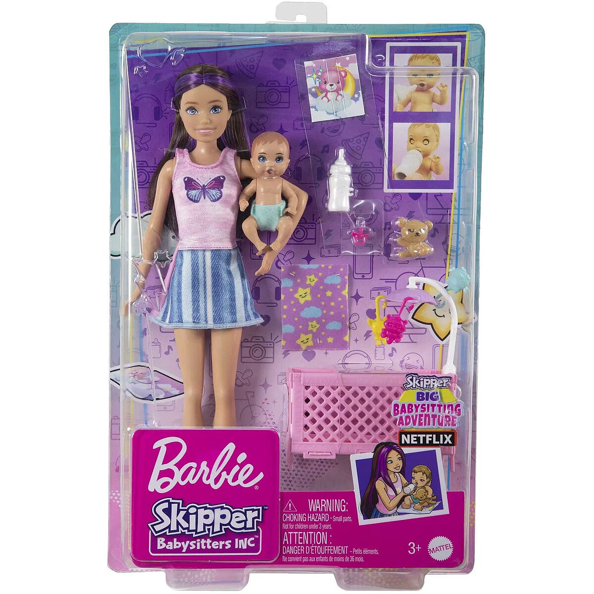 LongDesc - This bedtime-themed Barbie Skipper Babysitters Inc. playset inspired by the movie lets kids explore their nurturing side with Skipper doll, a baby doll -- with dreamy sleep feature -- a crib and storytelling pieces. Help give baby a bottle or pacifier and watch their eyes grow sleepy! Kids can collect all the Babysitters Inc. dolls and toys for endless Barbie babysitting adventures (each sold separately, subject to availability). Dolls cannot stand alone. Colours and decorations may vary.