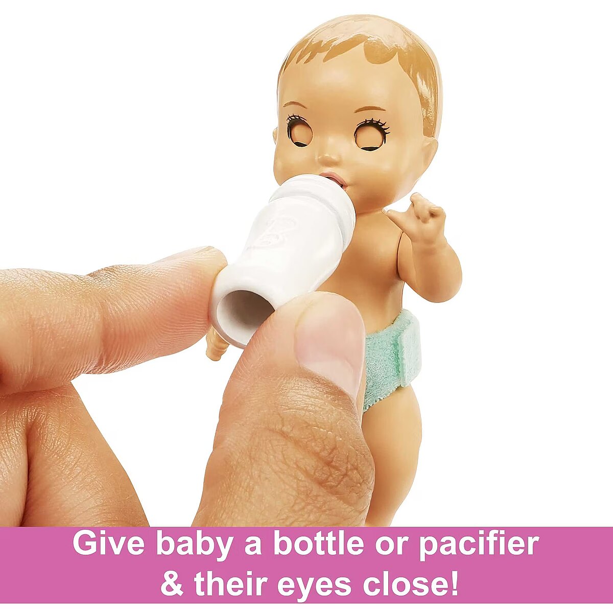 LongSummaryDescription - Barbie Skipper Babysitters Inc. Skipper Babysitters Playset with Skipper Doll, Baby Doll with Sleepy Eyes, Crib and Accessories. Doll type: Fashion doll, Doll's gender: Female, Recommended age (min): 3 yr(s), Suggested gender: Girl. Height: 266 mm, Weight: 607 g. Material: Plastic, Product colour: Multicolour