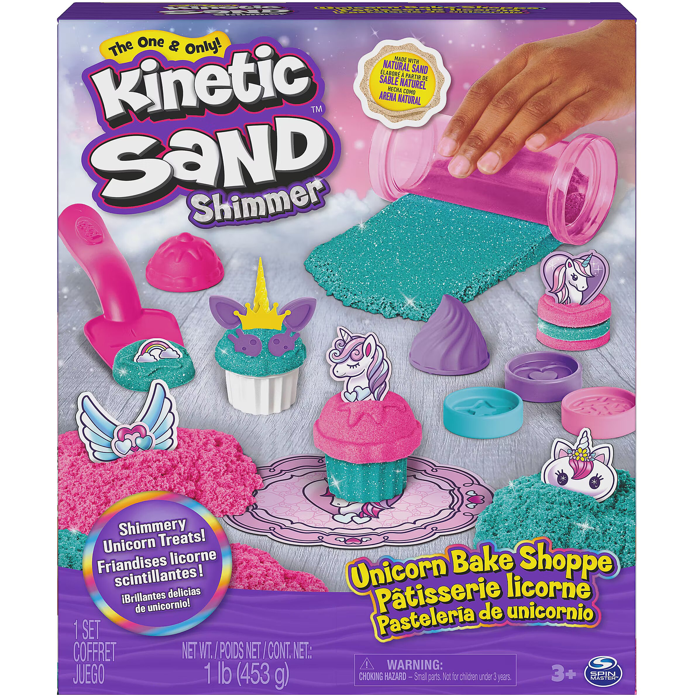 LongDesc - Run the ultimate Kinetic Sand Unicorn Bake Shoppe! This playset features 16oz of Kinetic Sand: 8oz of shimmer teal and 8oz of pink neon sand! Create unicorn cupcakes with the molds and tools! This set includes 3 cupcake molds, roller, spatula, 6 unicorn-themed accessories. Kinetic Sand is the original magical, moldable and mesmerizing play sand. Better than arts and crafts modeling clay, this sensory sand never dries out, so you can play with Kinetic Sand for hours of tactile independent play. It’s a great addition to sensory bins. Let it flow through your hands – it’s so satisfying, you won’t be able to put it down! Kinetic Sand is made with natural sand and is non-toxic and hypoallergenic. It magically sticks together and cleans up easily. Kinetic Sand develops creative and sensory skills and allows kids to create anything they can imagine! Kinetic Sand kids toys for 3 year old boys and girls are the perfect gift for kids.Includes: 8oz of shimmer Kinetic Sand, 8oz of Neon Kinetic Sand, 1 spatula, 3 cookie stampers, 1 roller, 3 cupcake molds, 11 accessories, 1x scene punch-outs
