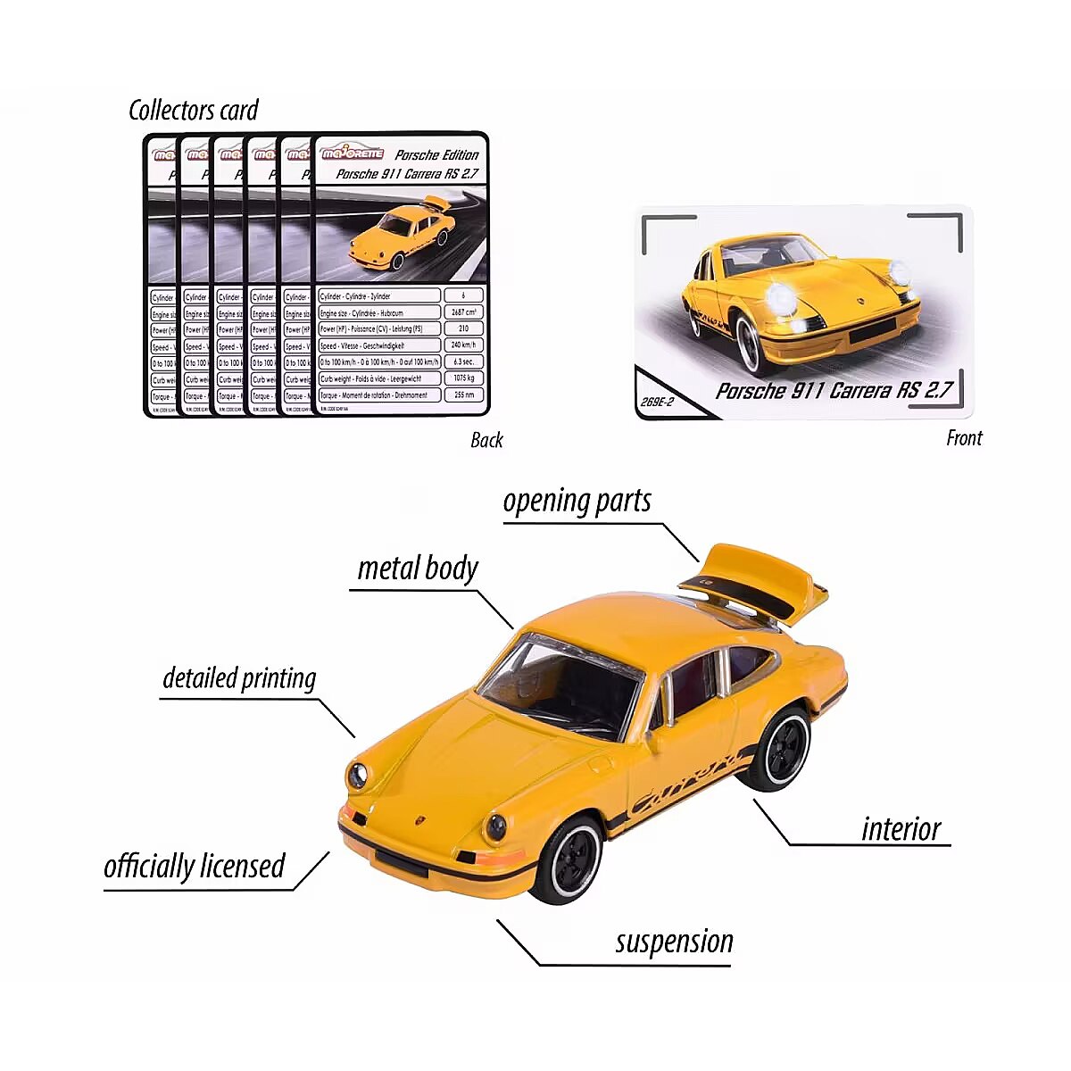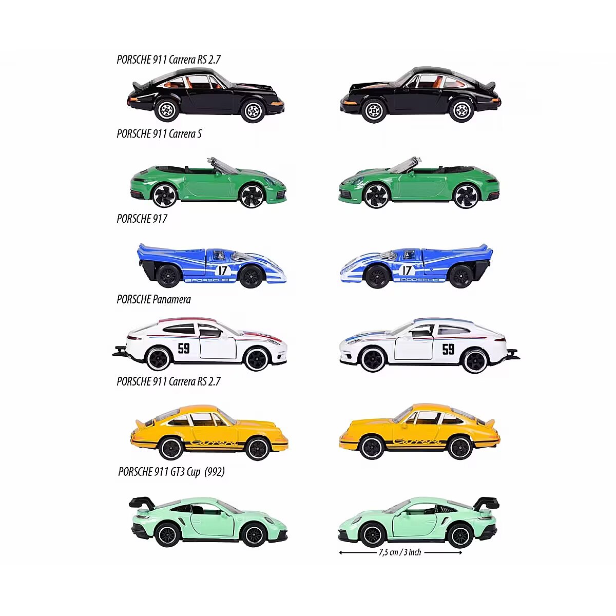 Description - Majorette cars for children aged 3 years and older the best toy or collector's item for motoring fans These premium die-cast vehicles, officially licensed by Porsche, are sure to impress! The iconic brand from France has been captivating motoring fans all over the world since 1964. The realistic and original licensed car models from the world-famous brand are manufactured to the highest quality standards and feature robust construction. From passenger cars, monster trucks, rescue and construction vehicles to racing cars, Majorette offers an extensive collection of die-cast cars and matching parking sets with different themes. The small die-cast cars are ideal for children aged 3/5 years and older and aspiring collectors of all ages. The Porsche Premium Edition includes the following 6 vehicles: 1. Porsche 911 Carrera S in green 2. Porsche 917 in blue 3. Porsche 911 Carrera RS 2.7 in black 4. Porsche 911 Carrera RS 2.7 yellow 5. Porsche 911 GT3 Cup (992) turquoise 6. Porsche Panamera white Each set contains 1 Porsche model, which is selected at random. Porsche models for enthusiastic fans Vehicles on a scale of 1:64 (7.5 cm), characterized by original design and intricately detailed chassis, will be a perfect gift for Porsche fans. Includes a collector's card containing vehicle technical data In addition to the premium toy vehicle, each set comes with a matching collector's card containing information on key vehicle parameters such as speed and number of cylinders. The product is sent randomly, it is not possible to choose a specific model. The price is for 1 pc.