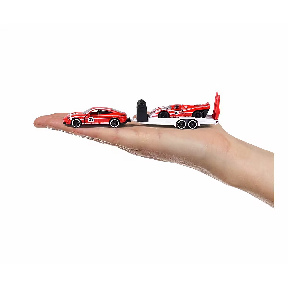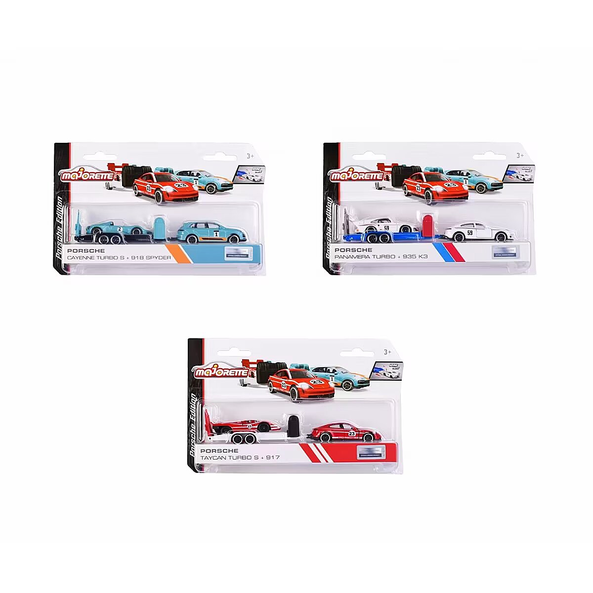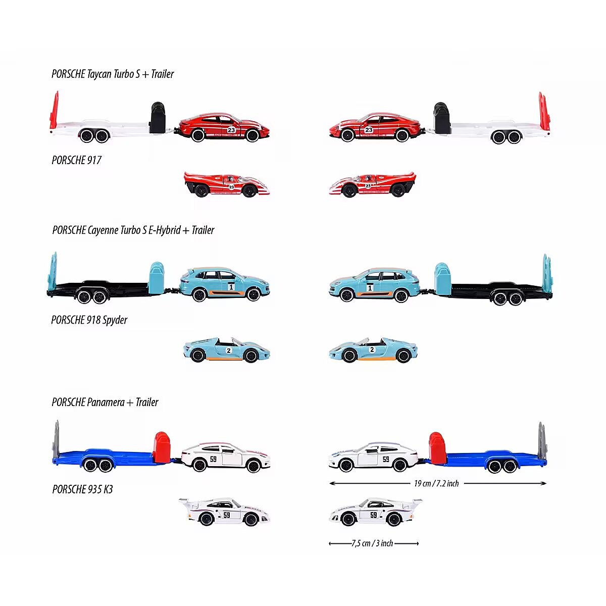 Description - The iconic brand from France has been captivating motoring fans all over the world since 1964. The realistic and original licensed car models of world-famous brands are manufactured to the highest quality standards and feature robust construction. From passenger cars, monster trucks, rescue and construction vehicles to racing cars, Majorette offers an extensive collection of die-cast cars and matching parking sets with different themes. The small die-cast cars are ideal for children aged 3/5 years and older and aspiring collectors of all ages. 2 cars with matching trailer Ready for your next race? The highlight of this Porsche model set is the large trailer, which can transport the racing car from point A to point B with the tow vehicle. The three-piece set is ideal for recreating scenes from the world of motorsport, alone or with friends. 3 different vehicle combinations: Each set contains two die-cast Porsche vehicles (1 racing vehicle, 1 tow vehicle) and a die-cast trailer in matching colours. 1. Porsche Cayenne Turbo S E-Hybrid, Porsche 918 Spyder, trailer 2. Porsche Panamera, Porsche 935 K3, trailer 3. Porsche Taycan Turbo S, Porsche 917, trailer Intricately detailed models for Porsche fans aged 3 and over All vehicles are officially licensed by Porsche and feature intricate construction. With a 1:64 scale construction (car with trailer: 19 cm), they are small enough to fit in any bag and have opening parts perfect for collectors and Porsche fans! Product shipped randomly, no specific model available. Price is for 1pc.