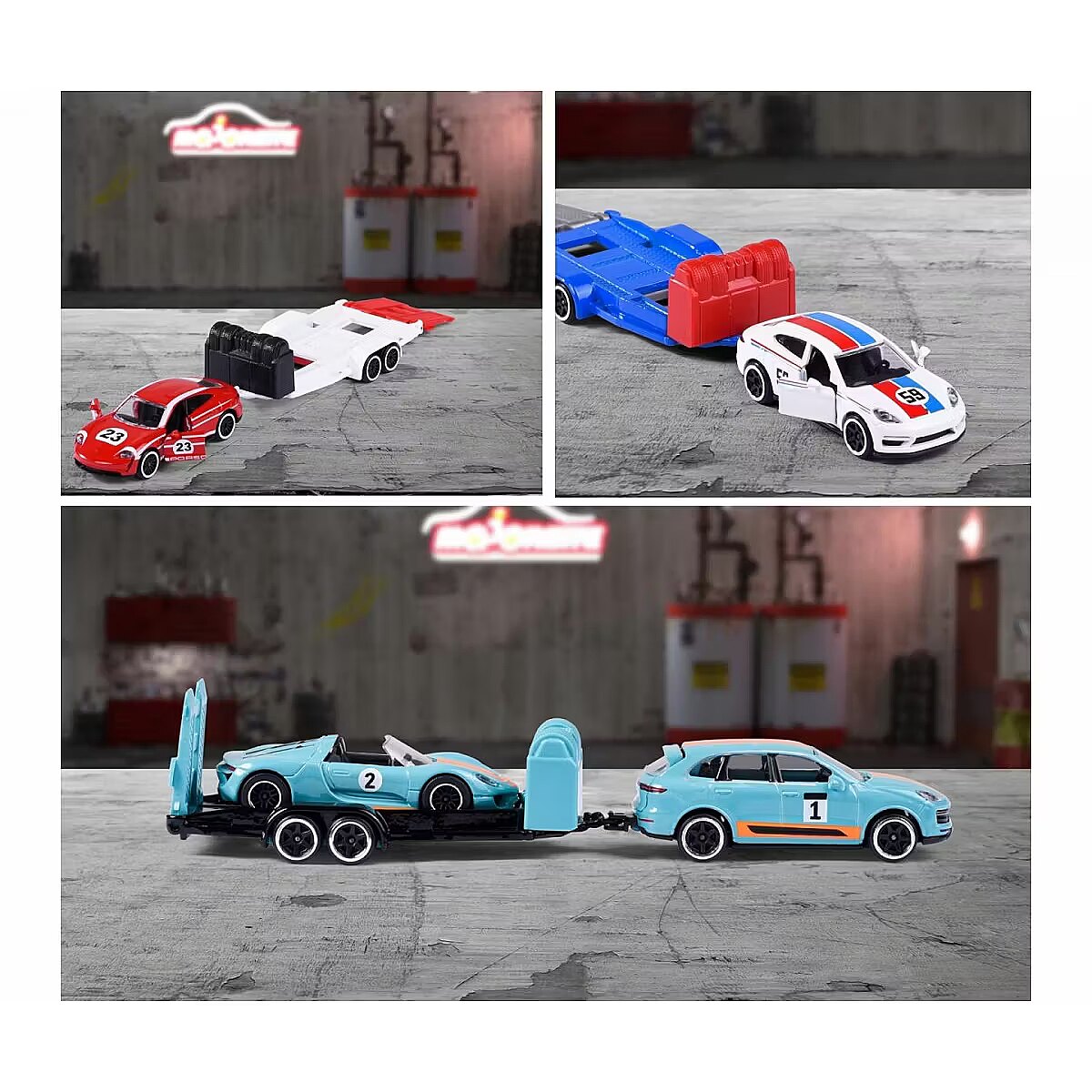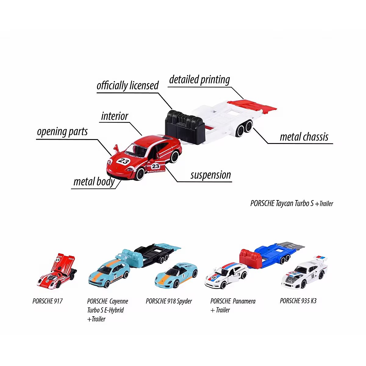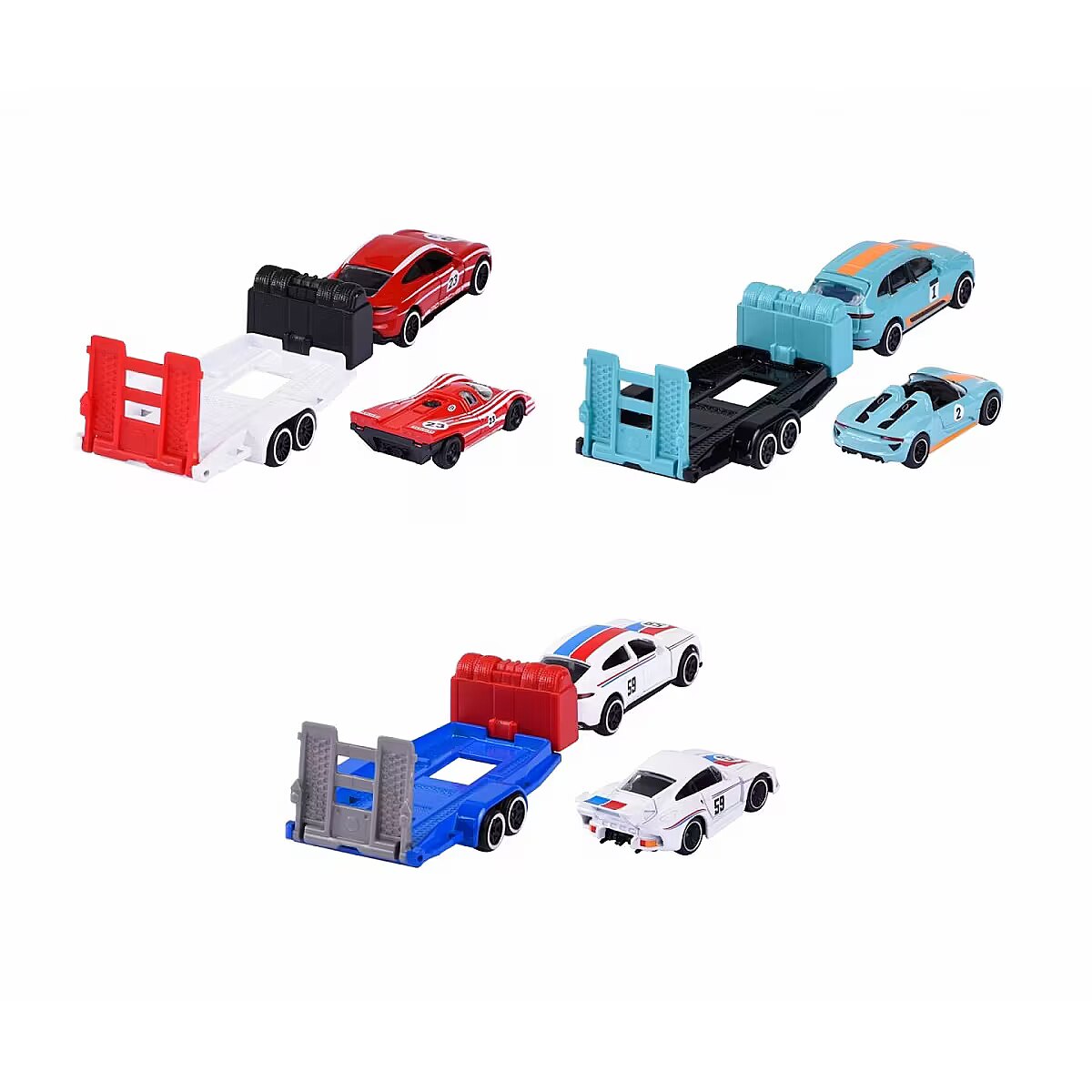 Description - The iconic brand from France has been captivating motoring fans all over the world since 1964. The realistic and original licensed car models of world-famous brands are manufactured to the highest quality standards and feature robust construction. From passenger cars, monster trucks, rescue and construction vehicles to racing cars, Majorette offers an extensive collection of die-cast cars and matching parking sets with different themes. The small die-cast cars are ideal for children aged 3/5 years and older and aspiring collectors of all ages. 2 cars with matching trailer Ready for your next race? The highlight of this Porsche model set is the large trailer, which can transport the racing car from point A to point B with the tow vehicle. The three-piece set is ideal for recreating scenes from the world of motorsport, alone or with friends. 3 different vehicle combinations: Each set contains two die-cast Porsche vehicles (1 racing vehicle, 1 tow vehicle) and a die-cast trailer in matching colours. 1. Porsche Cayenne Turbo S E-Hybrid, Porsche 918 Spyder, trailer 2. Porsche Panamera, Porsche 935 K3, trailer 3. Porsche Taycan Turbo S, Porsche 917, trailer Intricately detailed models for Porsche fans aged 3 and over All vehicles are officially licensed by Porsche and feature intricate construction. With a 1:64 scale construction (car with trailer: 19 cm), they are small enough to fit in any bag and have opening parts perfect for collectors and Porsche fans! Product shipped randomly, no specific model available. Price is for 1pc.