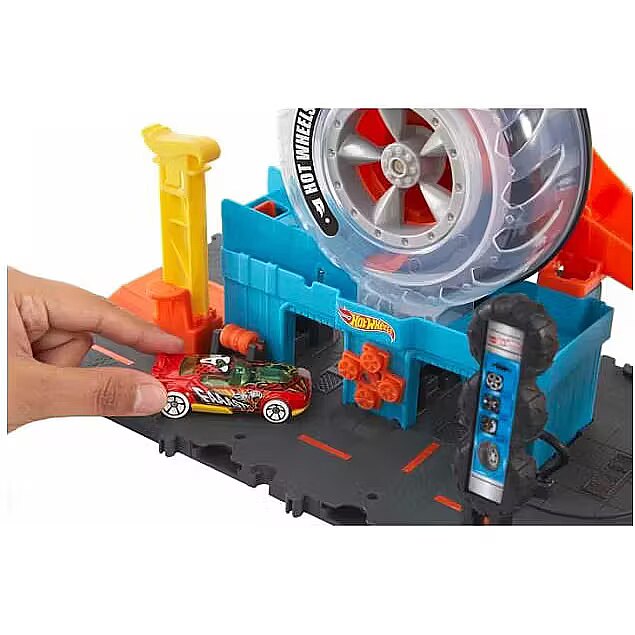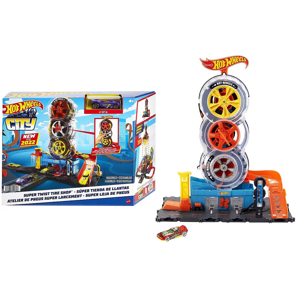 LongDesc - The Hot Wheels City Super Twist Tyre Shop is a thrilling playset that comes with one Hot Wheels car included and fits up to 4 diecast cars at once (additional vehicles sold separately). Use the lift to get the car toy ready before racing it through the translucent tyre structure, spinning the centre key to try different tracks. The base of the playset connects to other Hot Wheels sets and can be used with additional Hot Wheels track pieces (additional sets and tracks sold separately). Makes a brilliant gift for kids aged 4+.