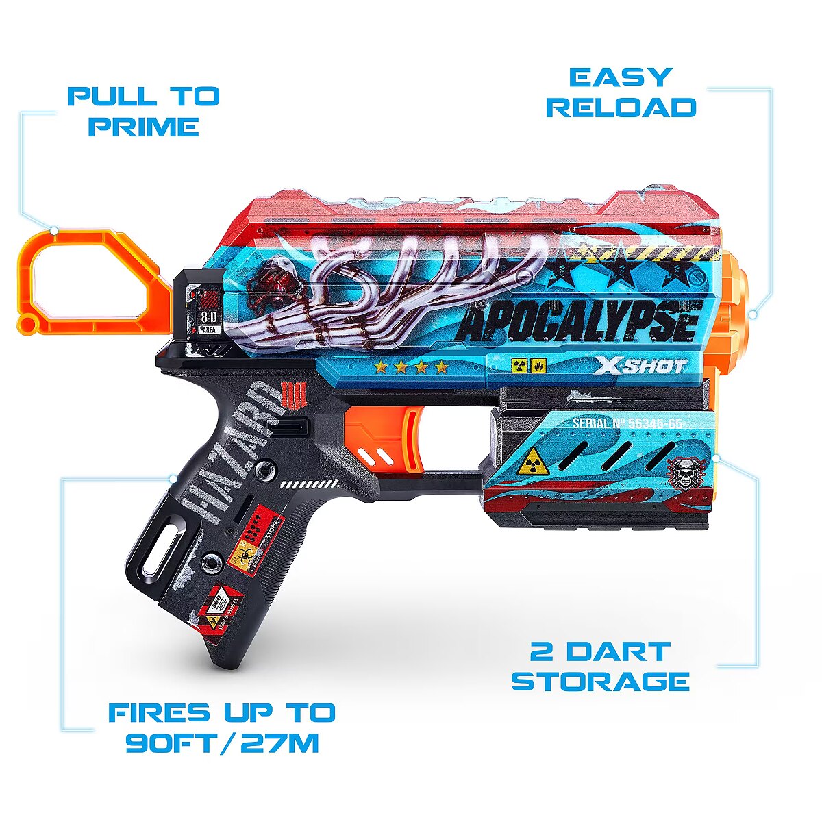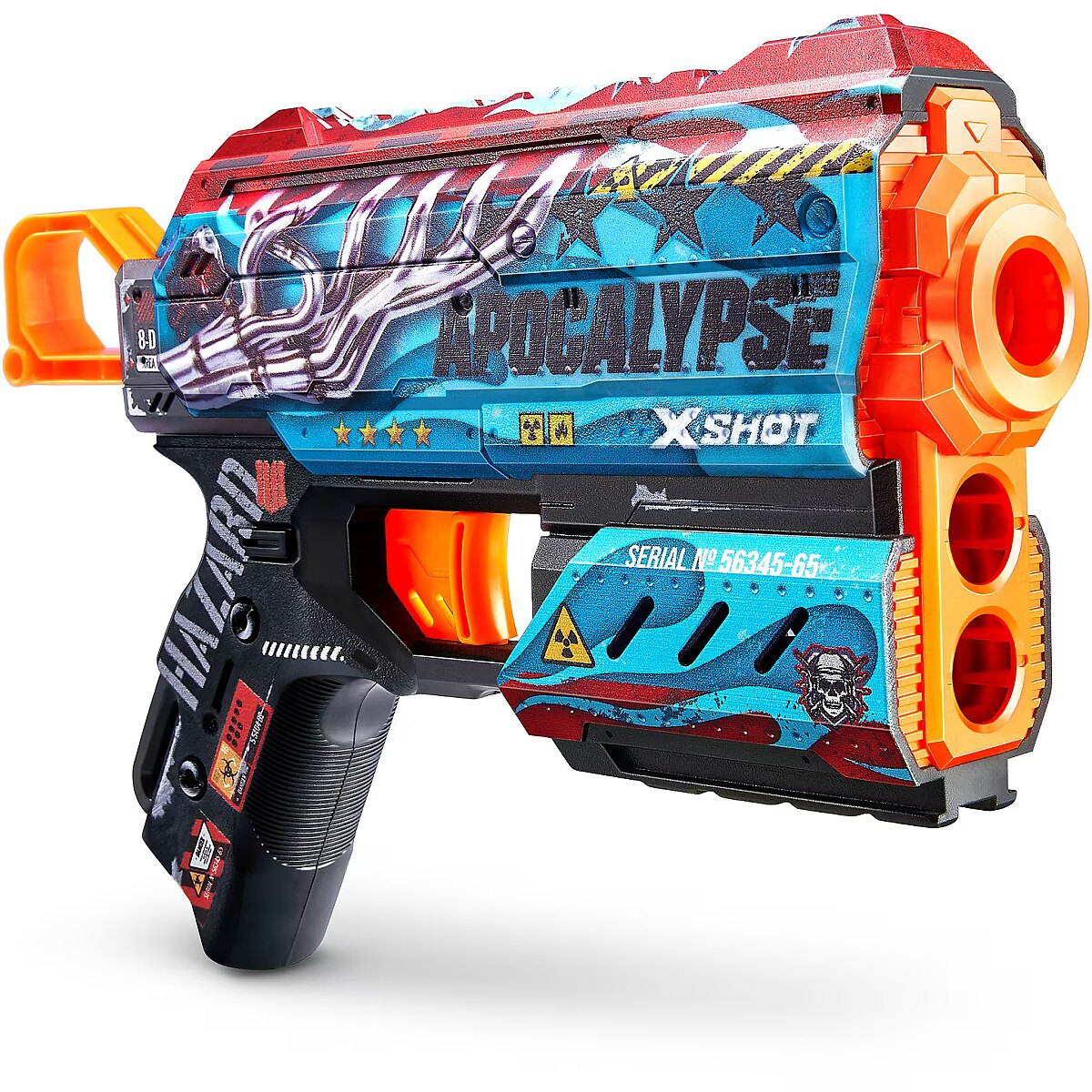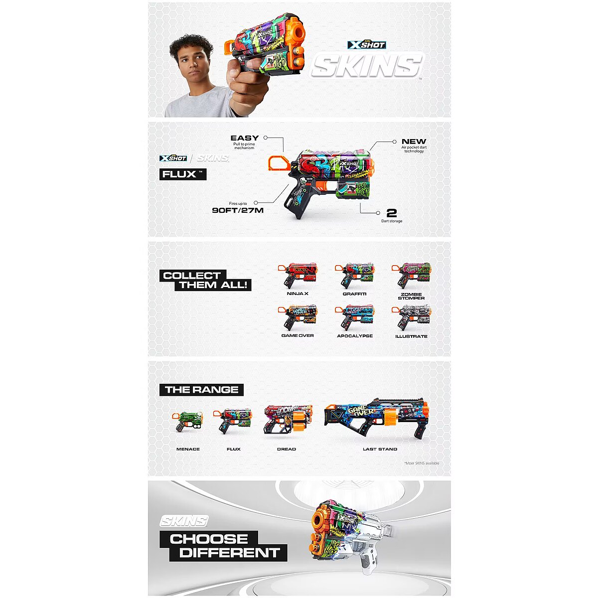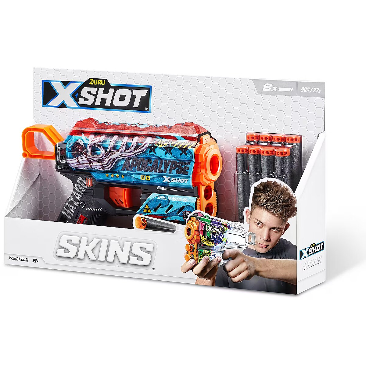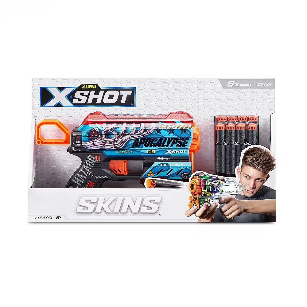 LongDesc - XSHOT Skins Flux Dart Blaster - Apocalypse (8 Darts) ZURUXSHOT Skins brings the in-game experience of skinning your blaster into the real world, choose your Skin and join the battle. Jump straight into the action with the XSHOT Skins Flux Apocalypse blaster. With a single dart capacity and 2 dart front storage, the easy to reload mechanism means you’re always ready for battle. The Flux can hit targets up to 27m / 90 feet away and recoils after every single shot for maximum power. Make sure you take down your enemies before they take you! XSHOT Skins darts include new air pocket technology for a faster, further, and more accurate shot.The XSHOT Skins Flux blaster comes in 6 unique skins to select and collect, to build your ultimate armoury. Choose different, choose XSHOT Skins.