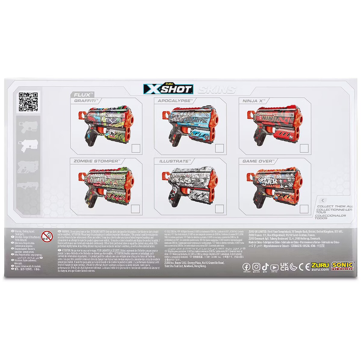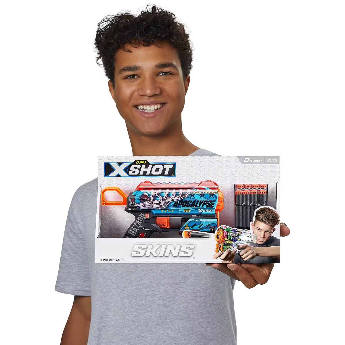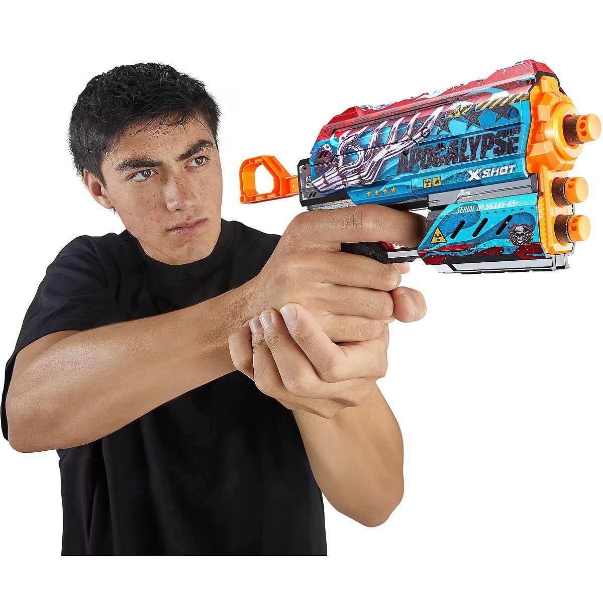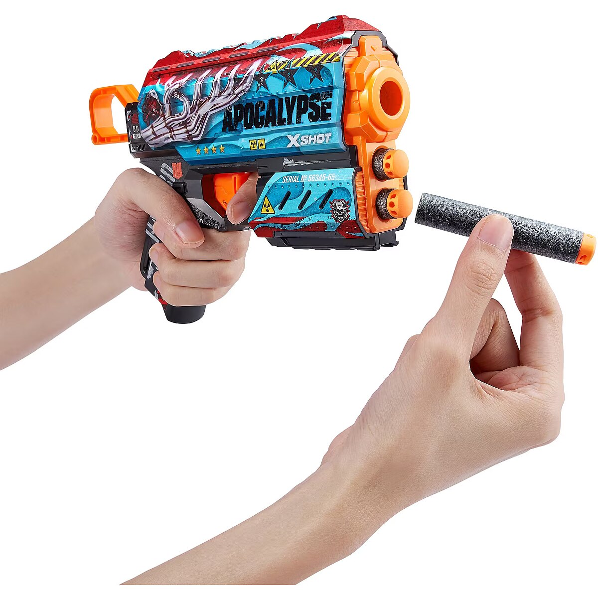 LongDesc - XSHOT Skins Flux Dart Blaster - Apocalypse (8 Darts) ZURUXSHOT Skins brings the in-game experience of skinning your blaster into the real world, choose your Skin and join the battle. Jump straight into the action with the XSHOT Skins Flux Apocalypse blaster. With a single dart capacity and 2 dart front storage, the easy to reload mechanism means you’re always ready for battle. The Flux can hit targets up to 27m / 90 feet away and recoils after every single shot for maximum power. Make sure you take down your enemies before they take you! XSHOT Skins darts include new air pocket technology for a faster, further, and more accurate shot.The XSHOT Skins Flux blaster comes in 6 unique skins to select and collect, to build your ultimate armoury. Choose different, choose XSHOT Skins.