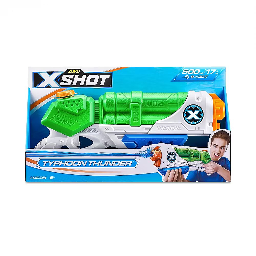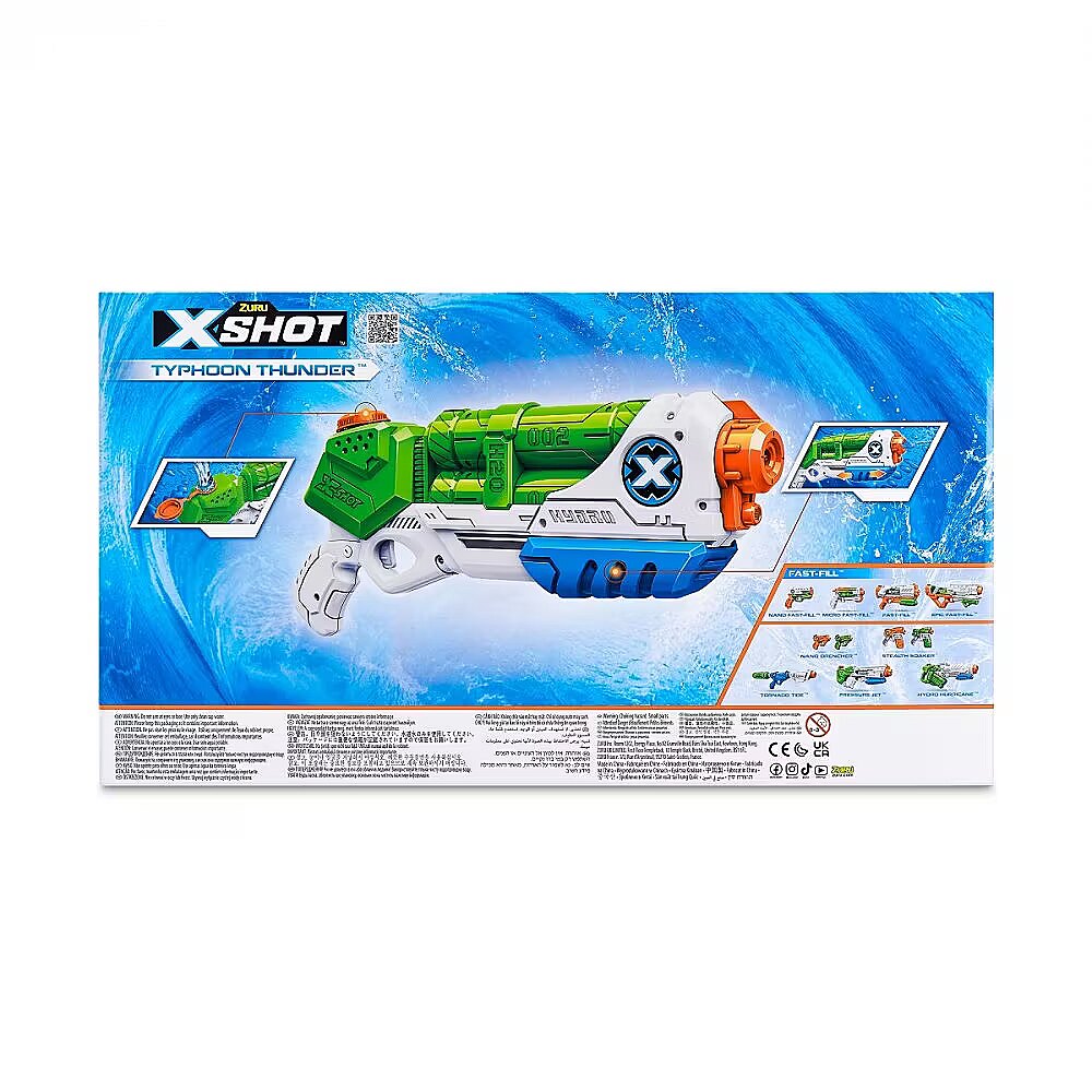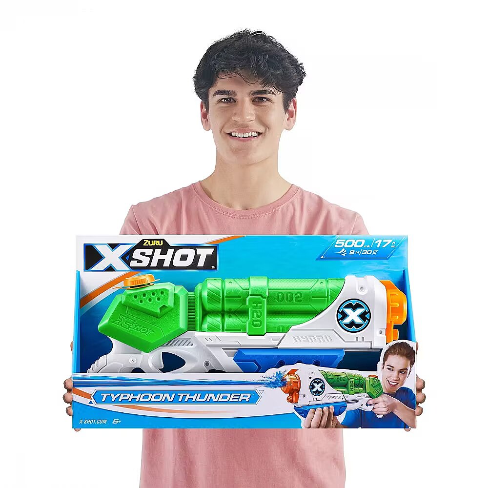 Description - X-Shot Water Warfare Typhoon Thunder launcher Beat the heat the tried and tested way - with a jet of water! X-Shot's arsenal of water launchers takes the fun of water shooting to the next level. Grab the unique Water Warfare Typhoon Thunder water blaster, with which you can shoot your opponents from up to 9 metres away! The action firing mechanism will allow you to wet several opponents at once and pave your way to victory with water bullets! The best water gun for kids for the summer. The X-Shot Water Warfare Typhoon Thunder water launcher will effectively encourage little summer lovers to have watery and active fun. The modern water blaster will allow you to combine two activities: the fun of aiming and shooting, as well as the fun of real water. The X-Shot water launchers will be perfect for hot summer days! With the large Water Warfare Typhoon Thunder launcher, you will beat the heat in just a few moments! Shoot at distances of up to 9 metres and don't worry too much about ammunition with the 550ml water tank capacity. The action firing mechanism ensures precise and fast shooting at long distance. The modern design is sure to appeal to active kids. The toy is suitable for children aged 5 years and over.