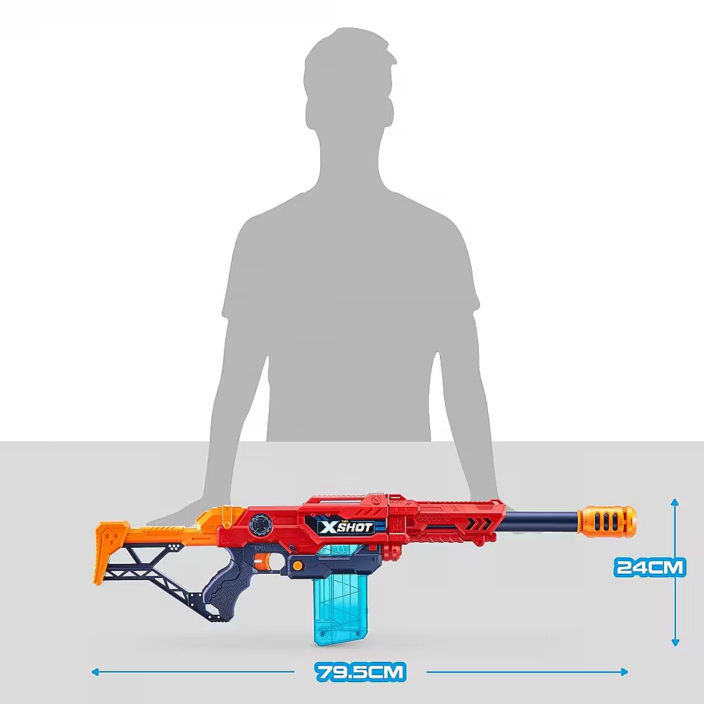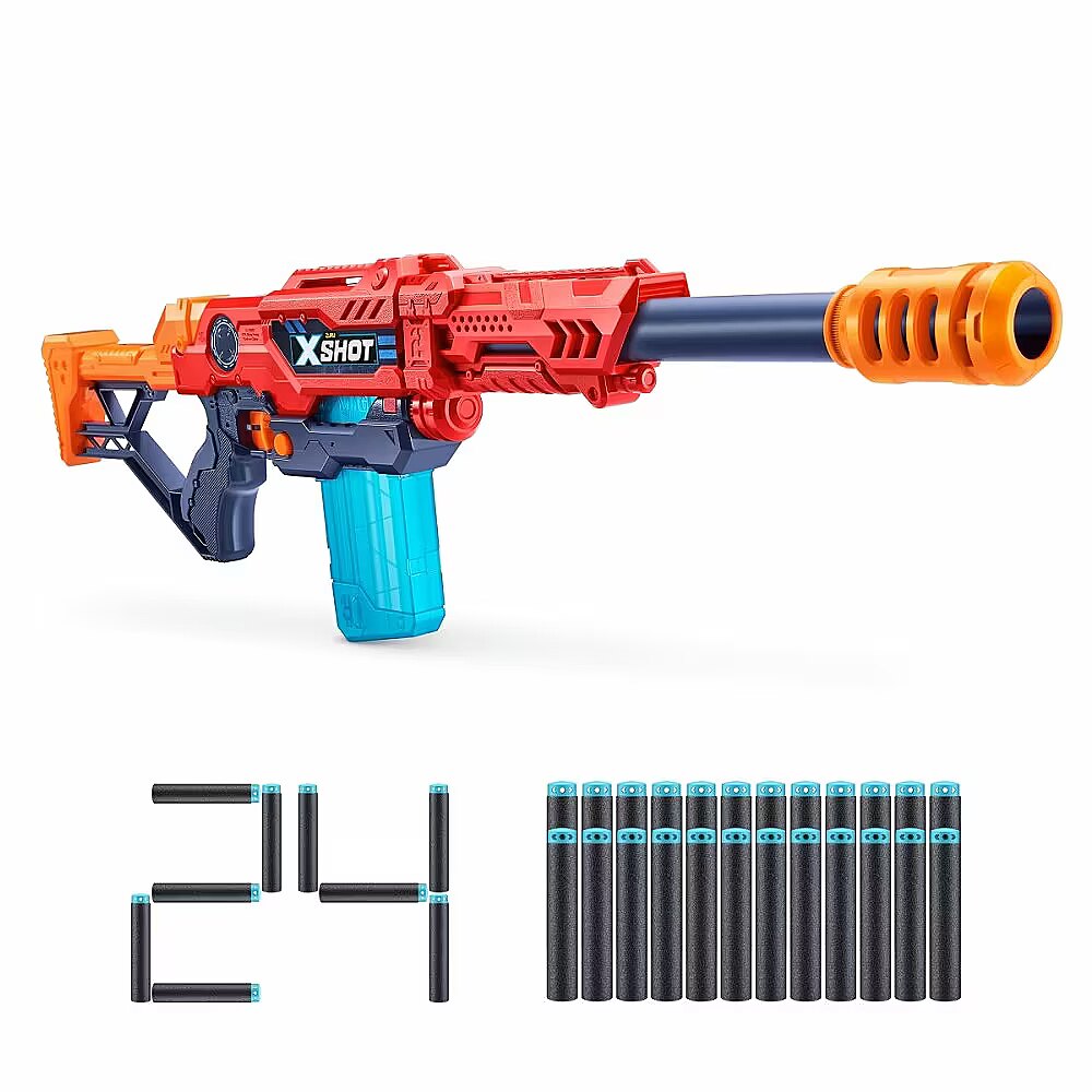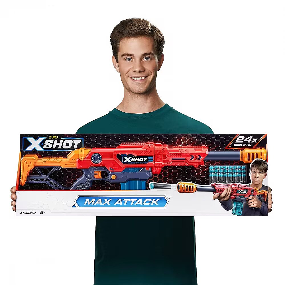Description - X-Shot Excel Launcher Max Attack 24 arrows Maximize your precision, power and accuracy with the X-Shot Excel Max Attack launcher! Load your blaster and shoot up to 24m away. Make precise shots from a long distance, using the potential of the garden or playground. The Max Attack launcher takes the fun to the next level. It holds 10 projectiles that can be fired up to 24 meters. The long barrel and modern design will appeal to children! The X-Shot Excel Max Attack launcher will allow for precise and exciting actions in the field. Hitting targets at a distance of up to 24 meters means even more new strategies and tactics during active play. Maximize precision with the new X-Shot Excel Max Attack launcher! The blaster has a magazine that holds 10 shots. The set includes a pack of 24 foam arrows. A set with the X-Shot Excel Max Attack launcher and 24 darts made of soft and safe foam. X-Shot foam projectiles use air pocket technology, so they go faster and hit the target better! Modern design with expressive colors for fans of military toys - it will surely awaken children's imagination! X-Shot foam projectile launchers are the perfect way to encourage children aged 8 and over to play actively outdoors!