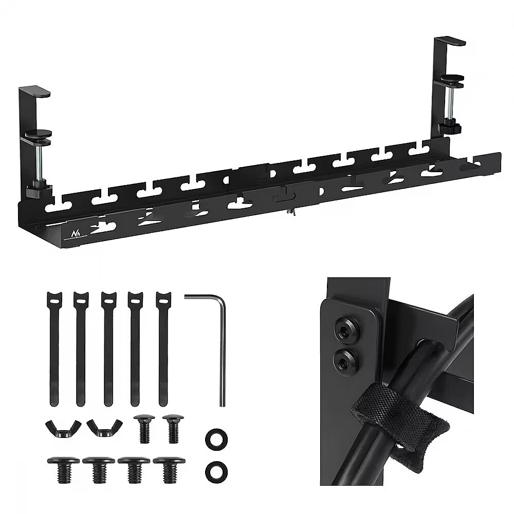 Accessories included - Maclean MC-103 B under-desk cable organizer Velcro cable ties (5 pieces) Mounting accessories Manufacturer's packaging