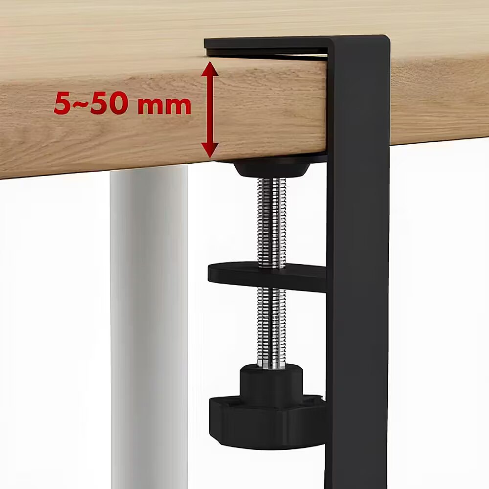Other features - Manufacturer: Maclean Model: MC-103 B Color: black Materials: powder-coated steel, ABS Length: 433-728 mm (adjustable) Depth: 120+124 mm Overall height: 342 mm Overall depth: 134 mm Mounting: countertop clamp Fits countertops of thickness: 5 to 50 mm Maximum load: 5 kg