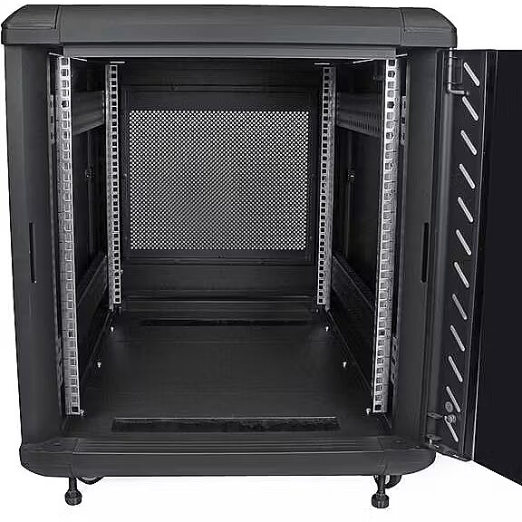 LongDesc - Securely store servers, network and telecommunications equipment in this 12U server rackThis server rack provides 12U of storage space in a sleek secure cabinet for storing EIA-310 compliant 19" rackmount devices such as Dell, HP and IBM servers along with telecommunication and A/V equipment. The rack creates a robust storage solution supporting a total load capacity of 800 kg. (1763.7 lbs).Hassle-free equipment installationThis rack has been engineered with different features that enable you to easily incorporate plenty of equipment.With adjustable mounting rails you can easily change the rail depth to up to 29 in. (740mm). These rails ensure the cabinet is widely compatible with your standard rackmountable equipment. The added depth also provides support for additional cable and power management behind your equipment.The rack features brushed ports on the ceiling and floor panels that enable you to easily run cabling to the inside and outside of the cabinet, for discreet cable management. The floor and ceiling panels can also be removed enabling you to customize your setup, and the rack features grounding lugs that enable you to ground your equipment for added protection.Securely protect your equipment while still being able to see itTo ensure you have full visibility of your equipment while securely locking it up, this rack has a stylish glass window on the front door. The glass door looks great in any server room, and gives you the freedom to clearly monitor equipment without the hassle of opening your rack.The rack also has removable side panels with independent locks quick-release mechanisms that enable you to easily access your equipment while still keeping it secure.Save money, with a cost effective, compact shipping containerThe cabinet comes in a flat packed box to reduce shipping volume, which significantly reduces your costs in shipping. Plus, because the rack is packaged efficiently, you can easily store the cabinet, for deployment at a later date.Maximum Maneuverability, with casters includedThe cabinet features casters ensuring hassle-free access to the rear mounted equipment, while providing ease of mobility around your office, studio or server room. Plus, the width and height of the rack fits through standard doorways, giving you the freedom to wheel your server rack into different rooms.Ensure your equipment is running at an optimal temperatureThe rear door on the rack is mesh, and the front glass door is vented, working together to increase airflow to provide passive cooling that's cost effective and ensures your equipment runs at an optimal temperature.The top ceiling panel features square venting holes that are cage nut compatible, which provide mounting points that enable you to add additional equipment at the top of your rack.The RK1236BKF is backed by a lifetime StarTech.com warranty with free technical support.The StarTech.com Advantage