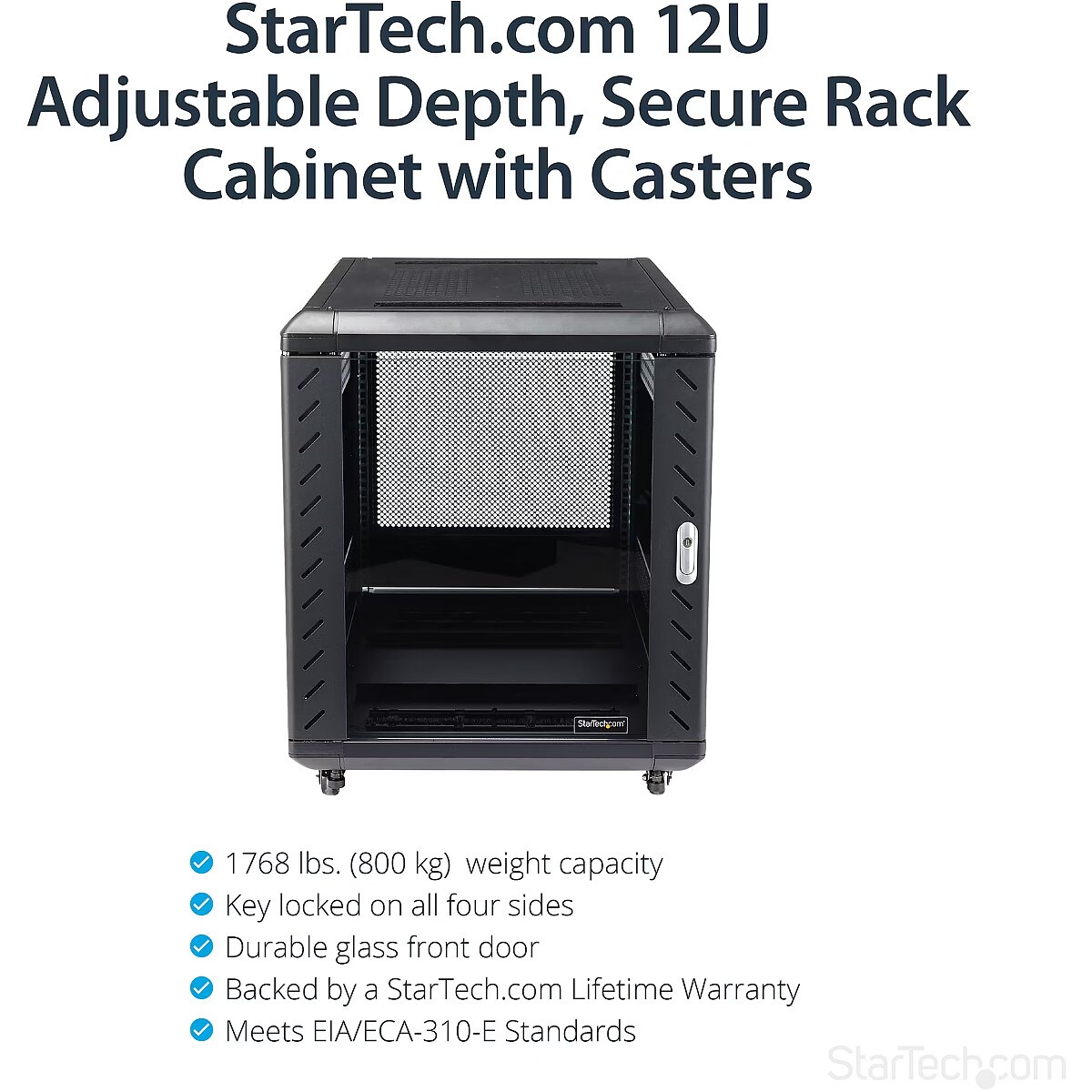 ShortSummaryDescription - StarTech.com 4-Post 12U Server Rack Cabinet, Lockable 19" Data Rack Cabinet for Computer / AV / IT Equipment, Office / Home Network Rack with Casters & Adjustable Mounting Rails, Freestanding rack, 12U, 800 kg, Key lock, Castor wheels, 43.5 kg