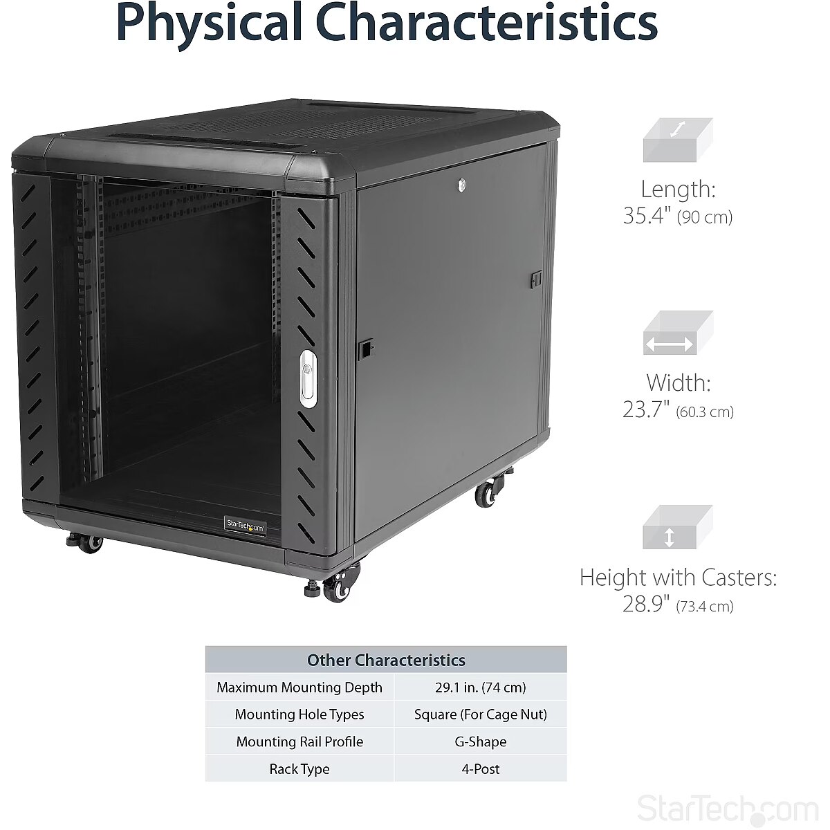 LongSummaryDescription - StarTech.com 4-Post 12U Server Rack Cabinet, Lockable 19" Data Rack Cabinet for Computer / AV / IT Equipment, Office / Home Network Rack with Casters & Adjustable Mounting Rails. Type: Freestanding rack, Rack capacity: 12U, Maximum weight capacity: 800 kg, Key lock, Castor wheels. Weight: 43.5 kg. Product colour: Black