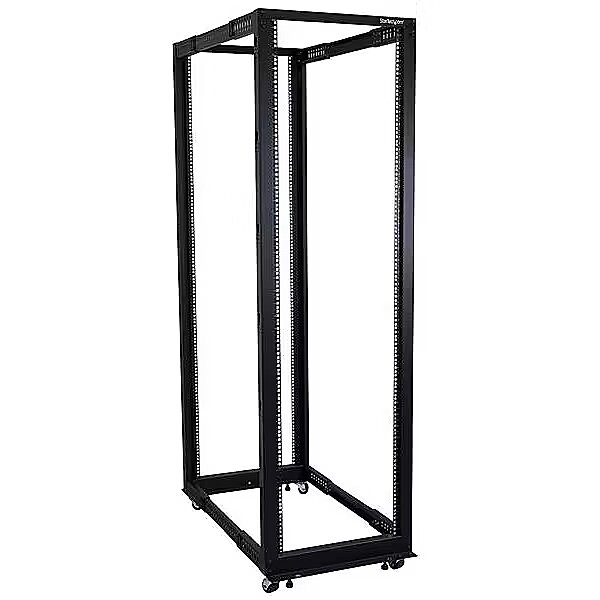 LongDesc - Computer Equipment Rack | 22" to 40" Adjustable Mounting Depth | Casters | Leveling Feet | Cable Management HooksThe 4POSTRACK42 42U Server Rack lets you store your servers, network and telecommunications equipment in a sturdy, adjustable depth open-frame rack.Designed with ease of use in mind, this 42U rack offers easy-to-read markings for both rack units (U) and depth, with a wide range of mounting depth adjustments (22 - 40in, 56,0 - 101,7cm) that make it easy to adapt the rack to fit your equipment.This durable 4-post rack supports a static loading capacity of up to 1322lbs (600kg), and offers compliance with several industry rack standards (EIA/ECA-310, IEC 60297, DIN 40494) for a universal design that's compatible with most rack equipment.For a complete rack solution that saves you time and hassle, the rack includes optional accessories such as casters, leveling feet and cable management hooks. The base is also pre-drilled for securing the rack to the floor if needed, providing you with many options to customize the rack to fit your environment.The StarTech.com Advantage