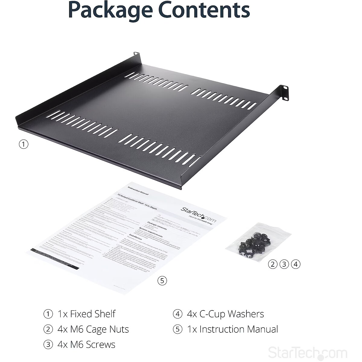 LongDesc - Add a sturdy, 1U server rack shelf into almost any rack or cabinetThis 1U rack shelf lets you add 16 in. of flat storage space to any EIA-310 compliant server rack or cabinet. The shelf is vented to improve air flow and help lower temperatures in your rack.Ensure your equipment is secureThe durable fixed-rack shelf can hold up to 20 kg (44 lbs.) of equipment and is constructed using SPCC commercial-grade cold-rolled steel.Make the most of your available spaceThe 1U cantilever shelf lets you optimize your working space by giving you the ability to mount equipment to your rack instead of taking up desk or floor space. It's perfect for your SOHO (small office, home office) environment, server room or any other location with limited space available.Customize your setupYou can install the 1U vented rack shelf in your rack at any height, giving you a stable surface for placing equipment that's un-mountable or storing your tools.The StarTech.com Advantage