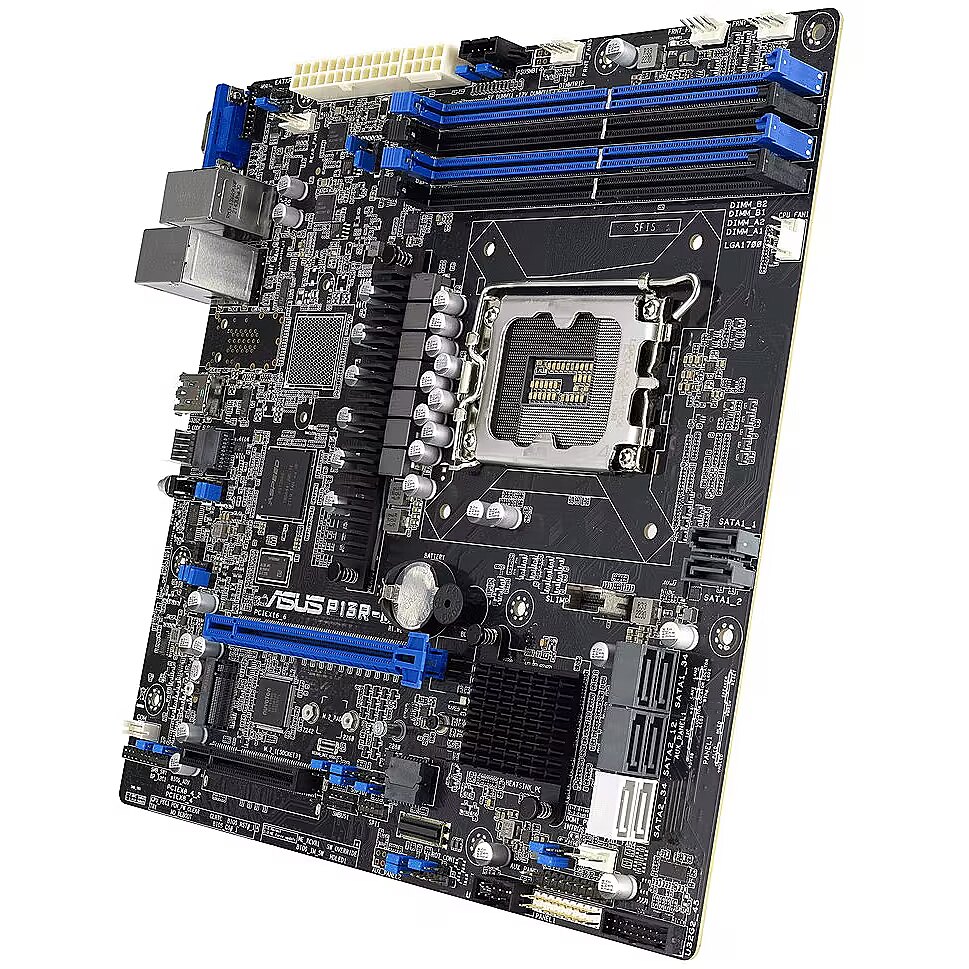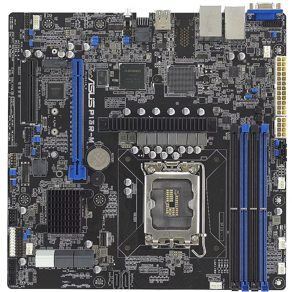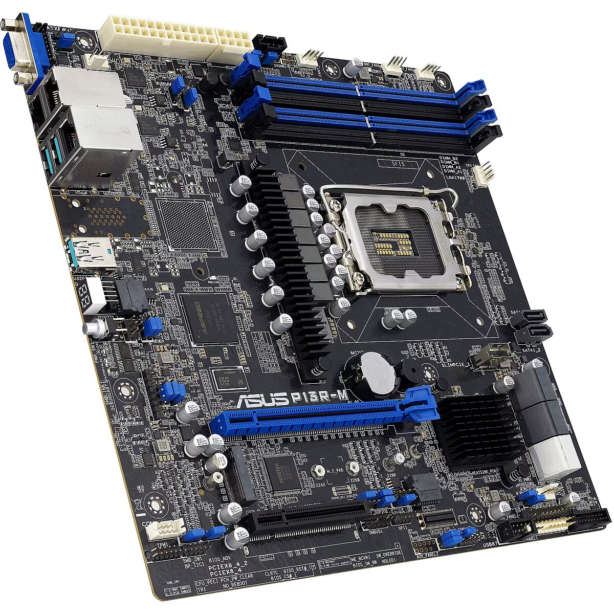 LongDesc - ASUS P13R-M is an Intel® Xeon® E-2400 LGA 1700 micro-ATX server motherboard with support for four DDR5 ECC UDIMM and one M.2 slot, plus dual LAN, eight SATA, one PCIe® 5.0 slot and one PCIe 4.0 slot, three USB 3.2 Gen 2, Platform Firmware Resilience (PFR) and onboard ASUS ASMB11-iKVM.PCIe 5.0 ReadyFaster storage, graphics and networking capabilities PCI Express® (PCIe®) 5.0 delivers 32GT/s bandwidth, which is twice the speed of PCIe 4.0, and offers lower power consumption, better land scalability and backwards compatibility. ASUS servers are PCIe 5.0 ready with scalability design to satisfy the increasing workloads for modern data center.Intel Xeon E-2400 processorsDesigned for small- to medium-sized businesses (SMBs) and cloud-service providers, offering robust and secure solutions. These processors support up to eight cores and 16 threads, with a maximum frequency of 5.6 GHz and a 95 W TDP, ensuring rapid data processing and application responsiveness. They support up to 128 GB of DDR5 4400 MT/s memory and PCIe 5.0 interfaces, providing server-grade 24/7 reliability for business-critical services and customer data, and cost-effective performance for entry-level bare-metal cloud services.Three fast USB 3.2 Gen 2 portsASUS P13R-M is equipped with three USB 3.2 Gen 2 ports on its rear I/O panel. These high-speed connections offer rapid data-transfer speeds of up to 10 Gbps, for fast, efficient and reliable file transfers. These sockets are also backward compatible, ensuring seamless connectivity with a wide range of USB devices.Dual Ethernet bandwidthWith dual onboard LAN powered by an Intel I210AT Ethernet controller, P13R-M server motherboards provide business-grade connectivity and support high-density, high-bandwidth, low-latency access-layer networks to ensure faster transfers of large-size files used in data-intensive applications.Comprehensive IT infrastructure managementP13R-M features an embedded iKVM module and is optionally equipped with ASUS Control Center, offering comprehensive out-of-band and in-band management features tailored for small and mid-size businesses. The embedded ASUS ASMB11-iKVM module supports remote BIOS updates, fan control, standalone KVMs, video recording and BSOD capture, providing around-the-clock remote monitoring and diagnostics. This functionality remains accessible even if the operating system is down or offline, through a user-friendly web-based graphical interface compatible with all major browsers. ASUS Control Center (ACC) further enhances IT infrastructure management, centralizing and integrating monitoring and control for ASUS commercial products, including servers, workstations, and digital signage. ACC enables remote BIOS updates, mobile device system monitoring, and simplified server management through one-click software updates and dispatching.Enhanced securityASUS P13R-M server motherboards integrate PFR FPGA as the platform Root-of-Trust solution for firmware resiliency to prevent from hackers from gaining access to infrastructure. ASUS security solutions are fully compliant with the 2018 National Institute of Standards and Technology (NIST) SP 800 193 specification.In addition, all P13R-M server motherboards servers also include support Trusted Platform Module 2.0 (TPM 2.0) to secure hardware through integrated cryptographic keys and offer regular firmware update for vulnerabilities.