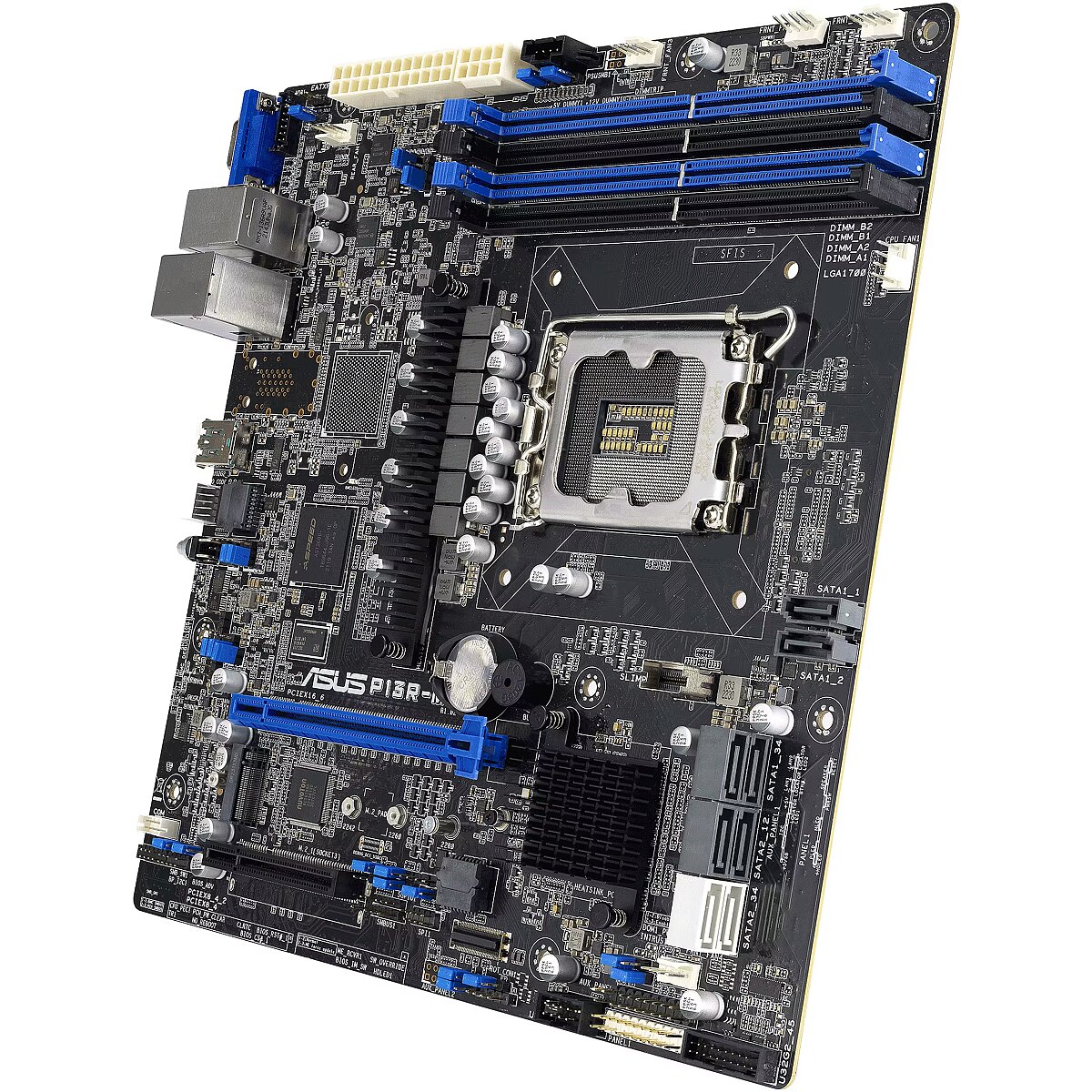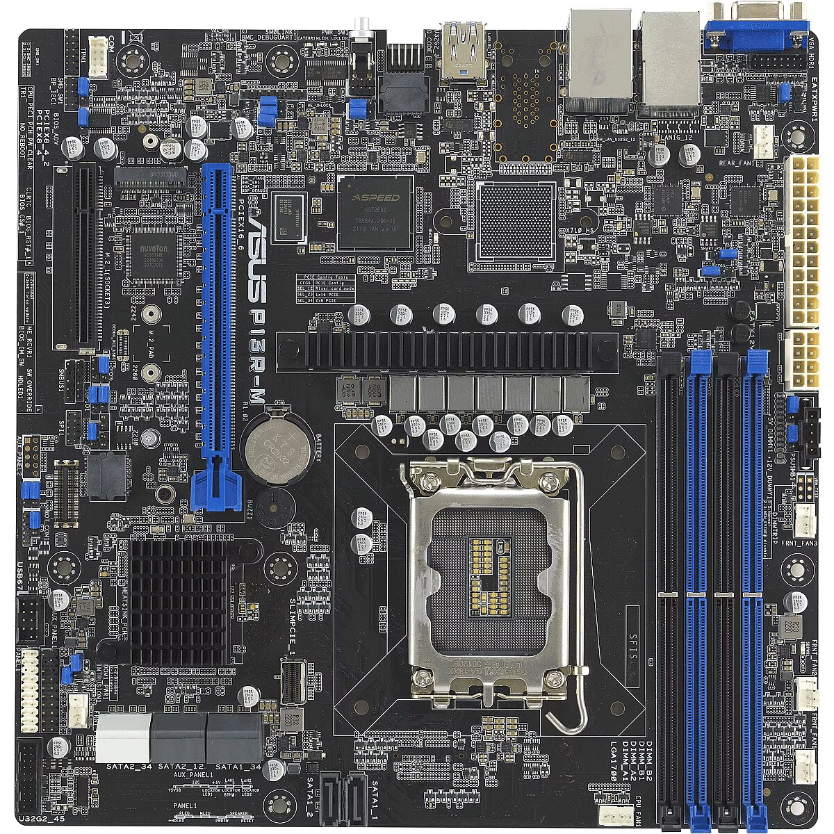 LongSummaryDescription - ASUS P13R-M. Processor manufacturer: Intel, Processor socket: LGA 1700, Compatible processor series: Intel® Pentium®, Intel Xeon E. Supported memory types: DDR5-SDRAM, Maximum internal memory: 128 GB, Memory slots type: DIMM. Supported storage drive interfaces: M.2, SATA III, Supported storage drive types: HDD & SSD. Graphics card family: ASPEED, Graphics card: AST2600. Ethernet interface type: Fast Ethernet, Gigabit Ethernet, LAN controller: Intel® I210-AT