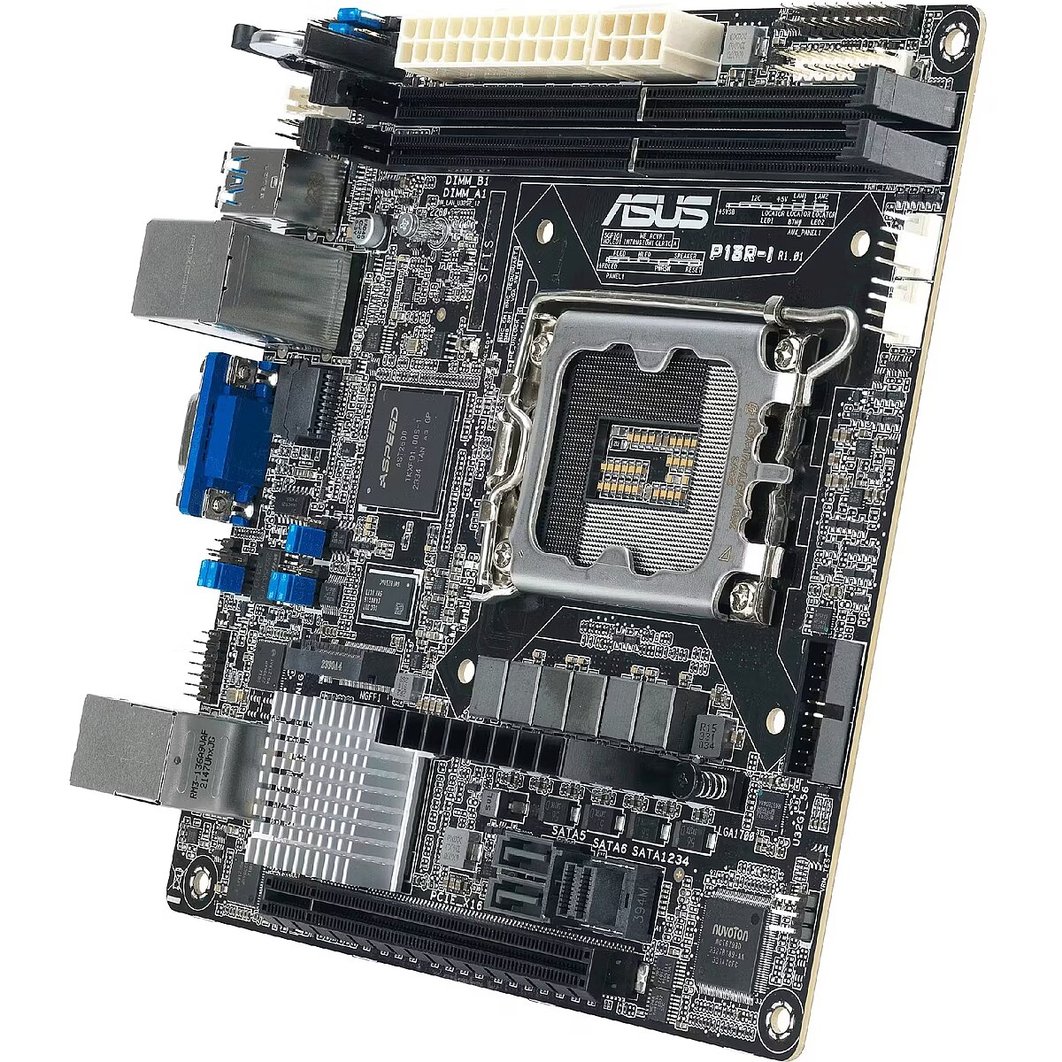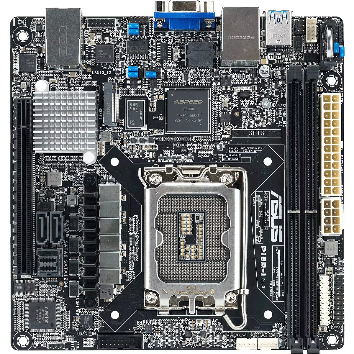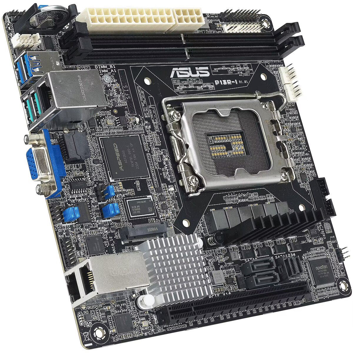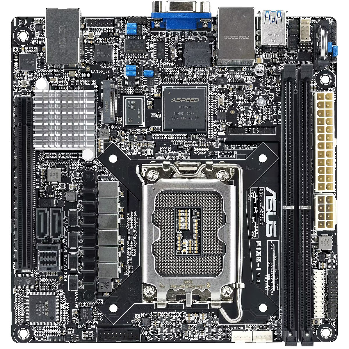 LongProductName - P13R-I is an Intel Xeon E-2400 and Intel Xeon 6300 LGA 1700 Mini-ITX server motherboard with two DDR5 ECC UDIMM slots, one M.2 slot, dual LAN ports, six SATA ports, one PCIe 5.0 slot, two USB 10Gbps ports and an onboard ASMB11-iKVM management module.