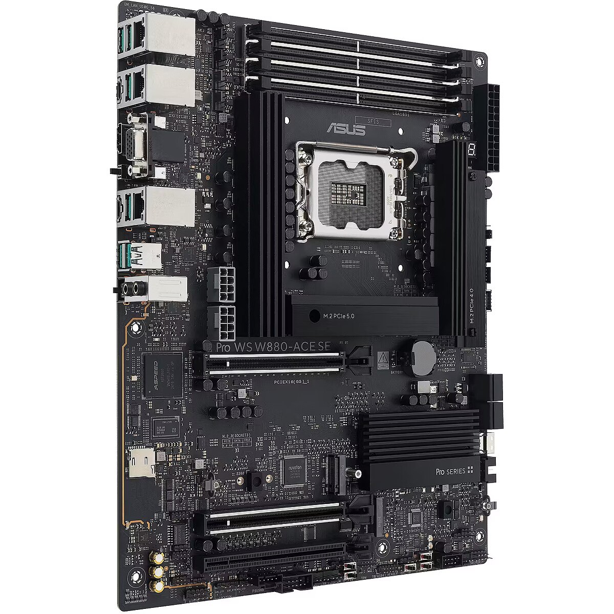 LongSummaryDescription - ASUS PRO WS W880-ACE SE. Processor manufacturer: Intel, Processor socket: LGA 1851 (Socket V1), Compatible processor series: Intel Core Ultra (Series 2). Supported memory types: DDR5-SDRAM, Maximum internal memory: 256 GB, Memory slots type: DIMM. Supported storage drive interfaces: M.2, PCI Express 4.0, PCI Express 5.0, SATA III, Supported storage drive types: HDD & SSD, RAID levels: 0, 1, 5, 10. Maximum resolution: 3840 x 2160 pixels. Ethernet interface type: 2.5 Gigabit Ethernet, Gigabit Ethernet