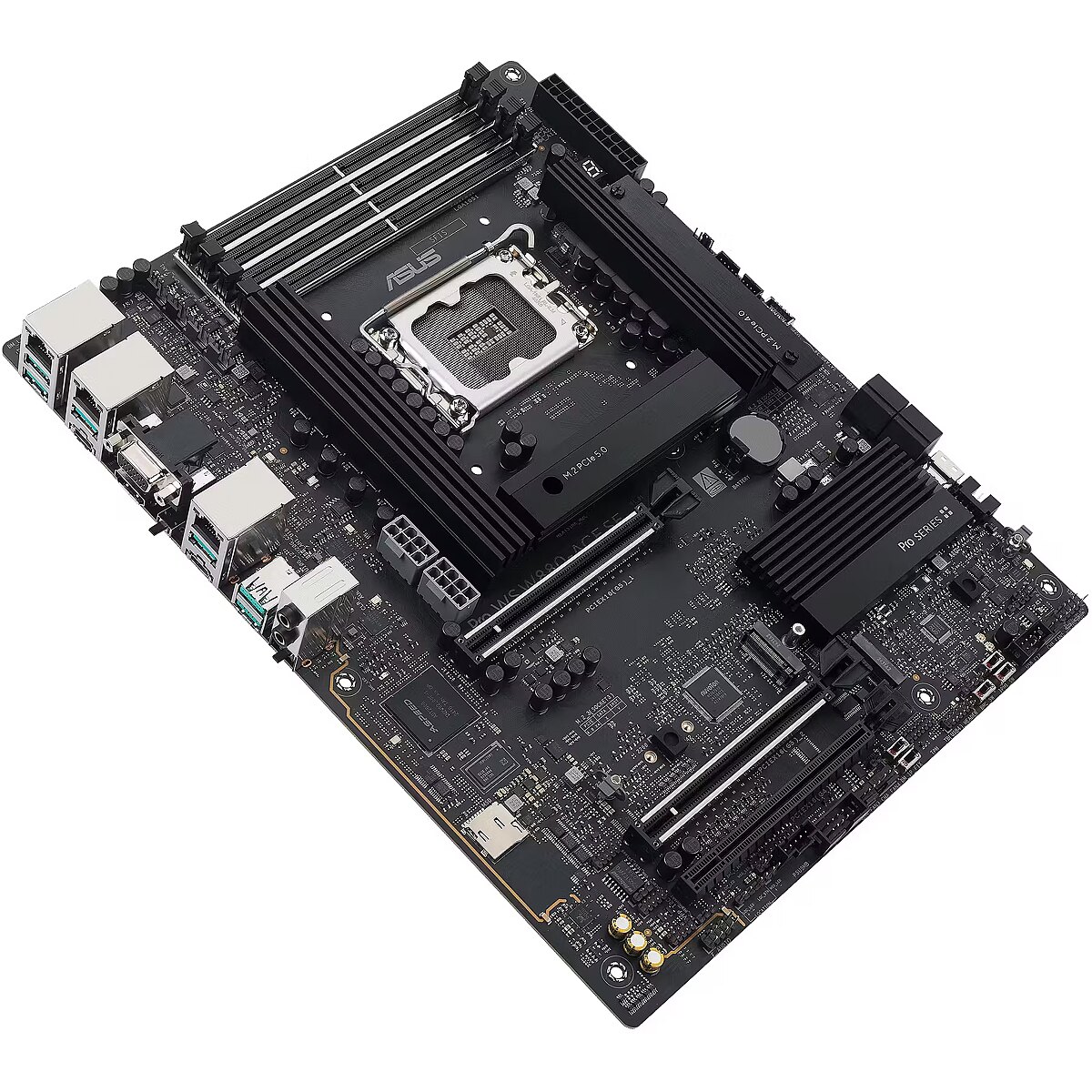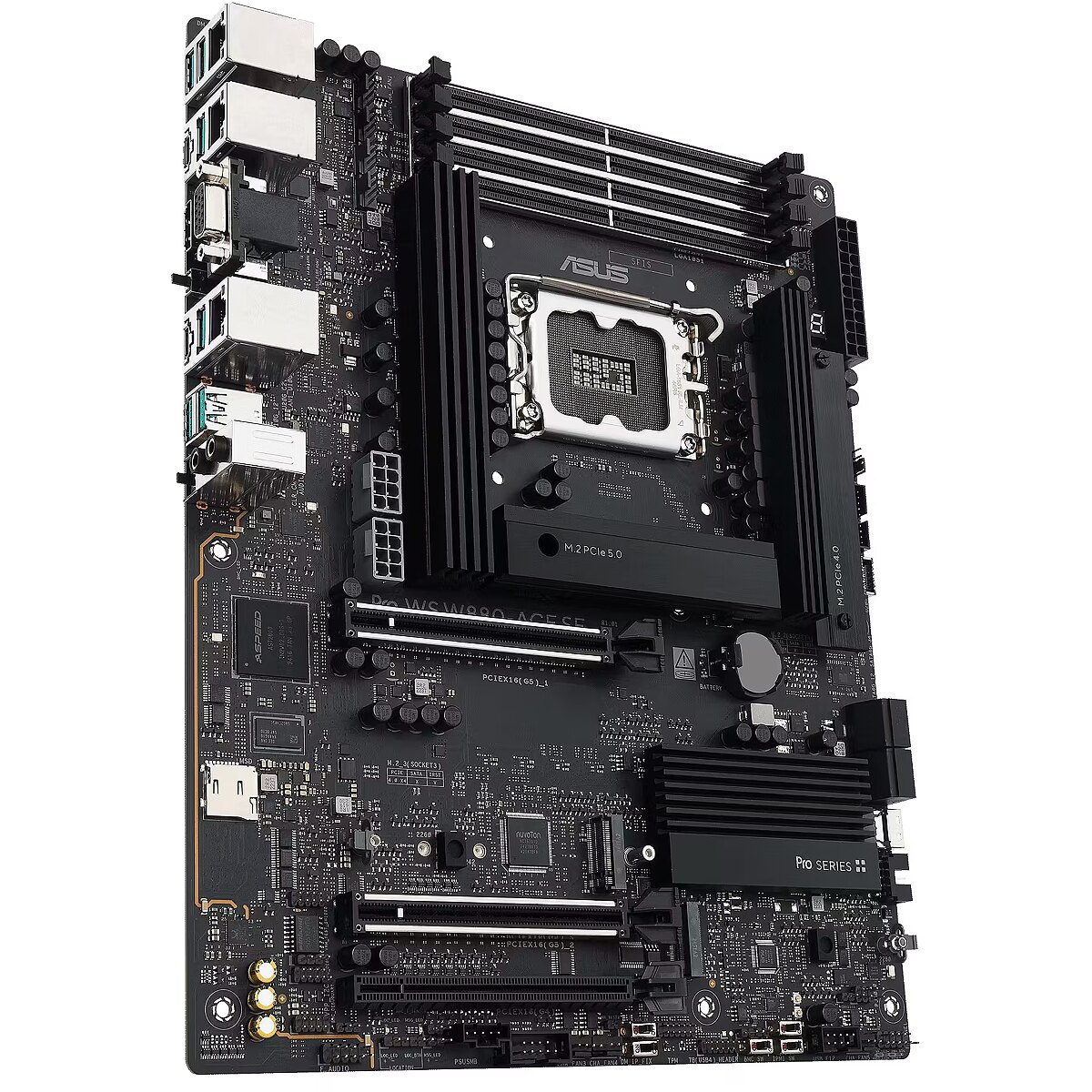 LongDesc - The Pro WS W880-ACE SE empowers workstation users of all levels by maximizing the performance of the latest Intel® Core™ Ultra Processor (Series 2) processors with 8+1+2+2 team power stages, DDR5 slots, PCIe® 5.0 and lightning-fast connectivity including Thunderbolt™ 4 port, dual 2.5Gb Ethernet.The workstation motherboard is engineered to support dual graphics cards, making it an ideal choice for content creation, AI and deep learning, and IT management.Thunderbolt™ ConnectivityThe Pro WS W880-ACE SE features a Thunderbolt™ 4 port, offering high-speed data transfers up to 40Gbps. This allows large files and datasets to be transferred in seconds, boosting productivity for workstation users, AI and deep learning experts, and IT managers. Thunderbolt™ 4 also supports multiple 4K displays or a single 8K display for clear and smooth visuals, essential for professional applications. Its strong compatibility with existing Thunderbolt™ and USB devices simplifies connectivity and management.PCIe 5.0 SupportThe Pro WS W880-ACE SE offers PCIe 5.0 support to give unfettered bandwidth to the fastest SSDs and graphics cards available.PCIe 5.0 Expansion SlotsBoth of the x16 expansion slots are PCIe 5.0, offering incredible speeds of up to 64 GB/s for compatible devices. To bear the brunt of massive graphics cards, they are also protected with SafeSlot retention brackets.Remote Control SolutionOnboard BMCThe Pro WS W880-ACE SE workstation motherboard features compatibility with BMC connections, and it is bundled with ASUS Control Center Express software to provide comprehensive in-band and out-of-band management features for businesses and industries.ASUS Control Center ExpressA dedicated chipset heatsink draws heat away to maintain optimum operating temperatures, and it comes with an active fan to enhance thermal efficiency.The Core of Your Powerful WorkstationDesigned to meet the needs of high-core-count CPUs, the Pro WS W880-ACE SE features 8(80A)+1(80A)+2(80A)+2(80A) power stages that integrate high-side and low-side MOSFETs and drivers into packages rated for up to 80 amps each. This configuration ensures optimal power delivery, efficiency, stability and performance for new Intel® Core™ Ultra Processors (Series 2).Eight Layered PCB designThese are built to tight specifications to ensure flush contact with PSU power lines. The resulting lower impedance helps to prevent hotspots and connector failure.ProCool II ConnectorsThis enhances quick heat dissipation around the voltage regulators for enhanced stability and overclocking.Superior Chokes & CapacitorsThese are engineered to resist extreme temperatures, providing a higher level of performance than the industry standard.Digi+ VRM ControlThe ASUS Digi+ voltage-regulator module (VRM) is one of the finest in the industry and ensures ultra-smooth power delivery to the CPU.Performance BoostNPU BoostThe integrated Neural Processing Unit in Intel® Core™ Ultra Processors (Series 2) efficiently accelerates AI workflows — and NPU Boost lets you do more with it. This BIOS feature overclocks the NPU with just one click, increasing performance by up to 24%. 1MemoryThe Pro WS W880-ACE SE enhances DDR5 performance by providing overclocking options that would otherwise be locked, whether you are dealing with high-speed or entry-level memory modules.DIMM FitDIMM Fit is an ASUS-exclusive BIOS feature that precisely analyzes individual memory modules to optimize performance and pinpoint potential issues. This offers peak efficiency, compatibility and system stability. Whether you are an overclocker seeking ultimate performance, a competitor pursuing the most responsive gameplay or a content creator prioritizing rock-solid stability, DIMM Fit provides optimizations tailored to your needs and your hardware configuration.AEMP IIIASUS Enhanced Memory Profile III (AEMP III) is an advanced firmware feature that empowers users to achieve unparalleled memory performance with cutting-edge CUDIMM memory. Through a two-phase comprehensive tuning process, AEMP III first optimizes the clock driver and then the memory frequency. This results in the best balance between performance and stability, even at cutting-edge speeds of DDR5-8000 or higher.2Intelligent AI SolutionsAI Cooling IIBalance the thermals and acoustics of any build with a single click.AI AdvisorUsing AI technology to understand natural-language questions or scenario descriptions, ASUS AI Advisor allows users to explore the functionality and advanced features of ASUS motherboards in a simple and straightforward way.3Easy PC DIYM.2 Q-LatchThe innovative ASUS Q-Latch makes it easy to install or remove an M.2 SSD without the need for specific tools or screws. This design employs a simple locking mechanism to secure the drive and neatly detach it with one tap.ASUS DriverHubASUS DriverHub streamlines the installation and management of ASUS drivers and utilities to keep your hardware up-to-date and perform optimally. This standalone application automatically detects current driver versions and presents available updates in a list view. Users are invited to install ASUS DriverHub after OS installation.Four Onboard M.2 SlotsThe Pro WS W880-ACE SE features one PCIe 5.0 M.2 slot and three PCIe 4.0 M.2 slots to enjoy the fastest data transfers of up to 128 Gbps, and all M.2 slots support NVMe RAID configurations to take advantage of the latest available speeds.424/7 ReliabilityOptimized for 24/7 operation, the Pro WS W880-ACE SE motherboard is tested to work at up to 45°C and 80% humidity, ensuring it can handle diverse operating environments.