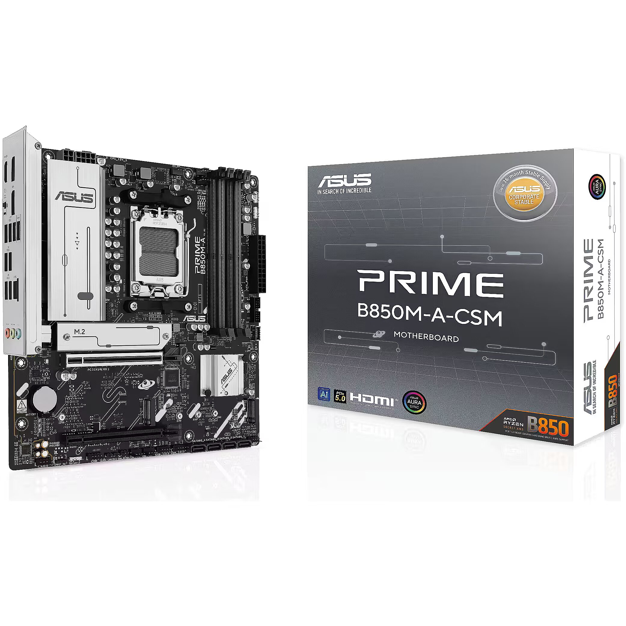 LongDesc - ASUS Prime series motherboards are expertly engineered to unleash the full potential of AMD Ryzen™ 9000 series processors. The PRIME B850M-A-CSM motherboard provides users and PC DIY builders with a range of performance optimizations via intuitive software and firmware features. It’s designed to be Advanced AI PC-ready, offering the power and connectivity needed for demanding AI applications.ASUS Corporate Stable ModelASUS Corporate Stable Model (CSM) is a commercial program designed to provide stable and reliable motherboards. Offering up to 36-month product lifecycle support and 6-month end-of-life notice to allow sufficient lead times for your organization to get ready for product transitions. Each purchase of an ASUS CSM motherboard comes with ASUS Control Center Express - server-grade IT management software.ASUS Control Center ExpressASUS Control Center Express is an integrated IT monitoring and management software designed to deploy faster, simplify IT operations and improve productivity with comprehensive control and user-friendly functions. ASUS Control Center Express is compatible with over 100 ASUS motherboards to provide a high-quality, TCO-optimized solution for your business needs.Optimize IT endpoint managementDesigned to assist IT staff in monitoring and controlling devices within their corporate networks, and facilitate inventory checking in multiple locations remotely.Automate IT maintenanceAllows IT staff to schedule automatic updates of the latest BIOS, software and utilities to specific or all devices at off-peak times, enhancing system stability and IT operational flexibility.Securely manage all of endpointsSecurely manage endpoint configuration, portable storage access and PC software applications by enabling them to create grouping rules on individual devices.PerformanceAI SolutionsASUS AI Solutions include AI Advisor as your technical expert with expertise in PC performance.AI AdvisorASUS AI Advisor allows users to explore the functionality and advanced features of ASUS motherboards in a simple and straightforward way.PerformanceDigital Power DesignPRIME B850M-A-CSM features an 8+2+1 phase power design with discrete MOSFETs, ensuring efficient and stable power delivery for AMD processors plus steady performance for day-to-day use.The multi-layered printed circuit board design quickly dissipates heat around the voltage regulators to improve overall system stability and provide the CPU with more overclocking headroom.The Digi+ voltage-regulator module (VRM) delivers real-time control over voltage droop, automatically switching frequency and power-efficiency settings.Enhanced Memory & Storage PerformanceEnhanced DDR5 performanceComprehensive memory tuning options are the cornerstone of PRIME motherboards. The PRIME B850M-A-CSM maximizes the potential of your DDR5 modules, from entry-level to extreme-speed kits.2For entry-level modules without EXPO™ support, ASUS Enhanced Memory Profile (AEMP) automatically detects memory chips and provides optimized profiles for enhanced performance.For those looking to surpass stock DDR5 speeds, the PRIME B850M-A-CSM offers extensive AMD Extended Profiles for Overclocking (EXPO™) support and a wide array of UEFI settings for further performance tweaks.Three M.2 slots (up to 128 Gbps)PRIME B850M-A-CSM offers a total of three M.2 slots, including one that supports data-transfer speeds of up to 128 Gbps via PCIe 5.0, and two that support PCIe 4.0. This enables quicker boot-up and app load times with OS or application drives.CoolingCooler by designThe PRIME B850M-A-CSM motherboard is engineered with multiple onboard heatsinks and an array of hybrid fan headers to help ensure your rig stays cool and stable under intense workloads.Smart Cooling precisionASUS Fan Xpert 2+ASUS Fan Xpert 2+ software provides comprehensive control over fans. An Auto-Tuning mode intelligently configures all parameters with a single click. There’s also an Extreme Quiet mode that reduces chassis fan speeds to below the default minimum to keep your system whisper-quiet when performing light tasks. Fans can also be controlled via the UEFI BIOS.Cooler compatibilityASUS AIO coolers offer robust performance, high overclocking potential, bold aesthetics and customizable functionality for new motherboards, empowering you to build your dream gaming rig.FlexibilityEmpowering connectionsThis motherboard offers a versatile range of connectivity, including support for PCIe 5.0 slot and an arsenal of USB ports which includes Type-C® connections.Realtek 2.5 Gb EthernetRealtek 2.5 Gb Ethernet reduces CPU overhead and offers exceptionally high TCP and UDP throughput for faster, smoother data transfers.Front USB 5Gbps Type-C®This motherboard features a USB 5Gbps Type-C® front panel connector for speedy data transfers of up to 5Gbps.CustomizationPersonalizationThe PRIME B850M-A-CSM enhances the user experience across the board, from simplifying BIOS setting adjustments to offering customizable RGB lighting controls for a uniquely personal system aesthetic.UEFI BIOSThe UEFI interface delivers easy-to-use configuration options for PC beginners, and advanced features for veterans.ASUS DriverHubSimplify driver management with automatic detection, one-click installation and update for smooth, efficient system performance.Armoury CrateCustomize Aura Sync RGB and control ASUS devices. Includes product registration and updates.Aura SyncComplete RGB lighting control for enthusiast systems, ensuring seamless synchronization with compatible hardware.Addressable Gen 2 RGB headersThree addressable Gen 2 headers detect LED counts on compatible RGB devices, automatically adjusting lighting effects accordingly.CustomizationDIY friendlyThe PRIME B850M-A-CSM motherboard features EZ PC DIY innovations that simplify and speed up the PC building process, making DIY easy and convenient.Pre-mounted I/O shieldOur pre-installed I/O shield safeguards ports, simplifies the build pro