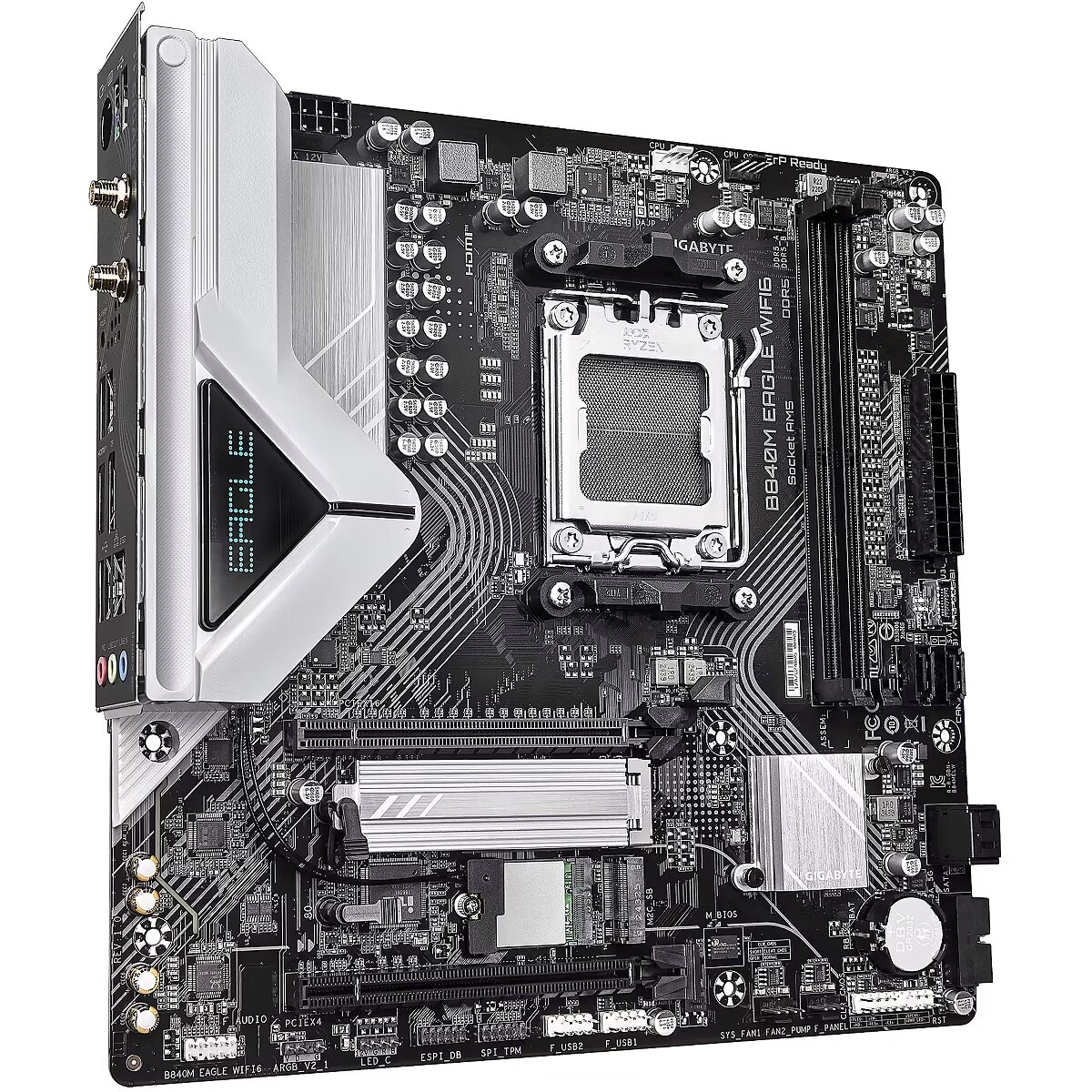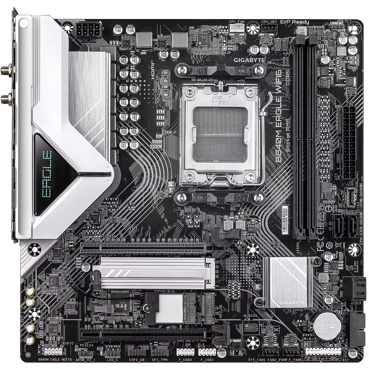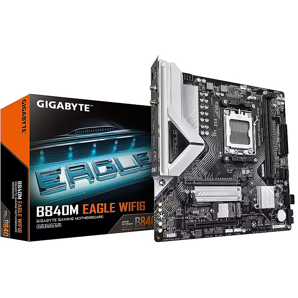 ShortSummaryDescription - GIGABYTE B840M EAGLE WIFI6 Motherboard - AMD Ryzen 9000 CPUs, 5+2+2 Phases VRM, up to 7600MHz DDR5(O.C), 1xPCIe 4.0 + 1xPCIe 3.0 M.2, Wi-Fi 6, 2.5GbE LAN, USB 3.2 Gen 1, AMD, Socket AM5, AMD Ryzen 7000 Series, AMD Ryzen 8000 Series, AMD Ryzen 9000 Series, Socket AM5, DDR5-SDRAM, 128 GB