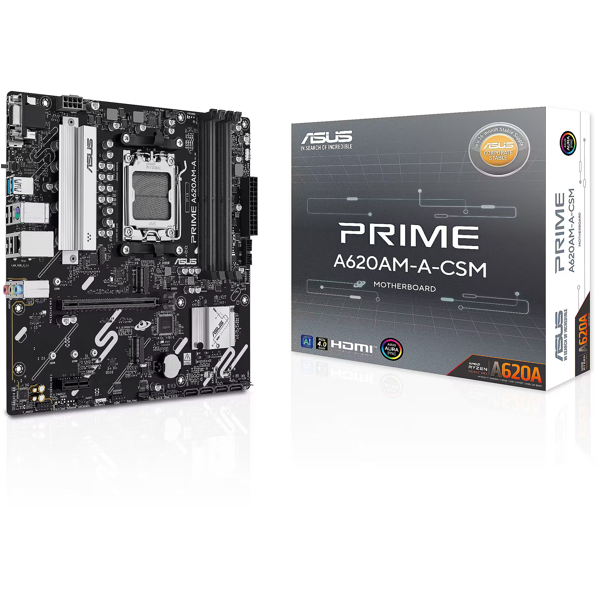 LongSummaryDescription - ASUS PRIME A620AM-A-CSM. Processor manufacturer: AMD, Processor socket: Socket AM5, Compatible processor series: AMD Ryzen 7000 Series, AMD Ryzen 8000 Series, AMD Ryzen 9000 Series. Supported memory types: DDR5-SDRAM, Maximum internal memory: 256 GB, Memory slots type: DIMM. Supported storage drive interfaces: M.2, SATA III, Supported storage drive types: HDD & SSD, RAID levels: 0, 1, 5, 10. Ethernet interface type: Gigabit Ethernet. Component for: PC, Motherboard form factor: micro ATX, Motherboard chipset family: AMD