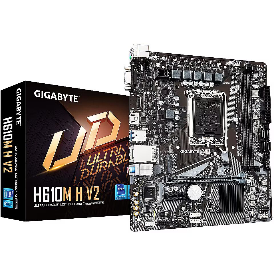 Technical_details - The GIGABYTE H610M H V2 motherboard is based on the Intel® H610 chipset and supports Intel® processors for Socket 1700. It has two DDR5 DIMM slots in dual-channel operation for up to 96 GB of RAM. The GIGABYTE H610M H V2's additional features include a PCIe 4.0 x16 slot and a PCIe 3.0 x1 slot. The GIGABYTE H610M H V2 also has 8-channel sound, a Gigabit LAN interface, four SATA3 ports and a number of USB interfaces. Item no.: 100038234 Mainboard type EAN 4719331859985 Manufacturer no. H610M H V2 Base 1700 Max. supported CPUs 1 Operating system support Windows 10 ready, Windows 11 ready Processor Supported models Core i3 12xxx (Alder Lake), Core i3 12xxxT (Alder Lake), Core i3 12xxxF (Alder Lake), Core i3 13xxx (Raptor Lake), Core i3 13xxxF (Raptor Lake), Core i3 13xxxT (Raptor Lake) , Core i5 12xxx (Alder Lake), Core i5 12xxxK (Alder Lake), Core i5 12xxxKF (Alder Lake), Core i5 12xxxT (Alder Lake), Core i5 12xxxF (Alder Lake), Core i5 13xxx (Raptor Lake), Core i5 13xxxF (Raptor Lake), Core i5 13xxxT (Raptor Lake), Core i5 13xxxK (Raptor Lake), Core i5 13xxxKF (Raptor Lake), Core i5 14xxx (Raptor Lake-S), Core i5 14xxxF (Raptor Lake-S) , Core i5 14xxxK (Raptor Lake-S), Core i5 14xxxKF (Raptor Lake-S), Core i5 14xxxT (Raptor Lake-S), Core i7 12xxx (Alder Lake), Core i7 12xxxK (Alder Lake), Core i7 12xxxKF (Alder Lake), Core i7 12xxxT (Alder Lake), Core i7 12xxxF (Alder Lake), Core i7 13xxx (Raptor Lake), Core i7 13xxxF (Raptor Lake), Core i7 13xxxT (Raptor Lake), Core i7 13xxxK (Raptor Lake), Core i7 13xxxKF (Raptor Lake), Core i7 14xxx (Raptor Lake-S), Core i7 14xxxF (Raptor Lake-S), Core i7 14xxxK (Raptor Lake-S), Core i7 14xxxKF (Raptor Lake-S) , Core i7 14xxxT (Raptor Lake-S), Core i9 12xxx (Alder Lake), Core i9 12xxxK (Alder Lake), Core i9 12xxxKF (Alder Lake), Core i9 12xxxT (Alder Lake), Core i9 12xxxF (Alder Lake) , Core i9 12xxxKS (Alder Lake), Core i9 13xxx (Raptor Lake), Core i9 13xxxF (Raptor Lake), Core i9 13xxxT (Raptor Lake), Core i9 13xxxK (Raptor Lake), Core i9 13xxxK (Raptor Lake), Core i9 13xxxKF (Raptor Lake), Core i9 13xxxKS (Raptor Lake), Core i9 14xxx (Raptor Lake-S), Core i9 14xxxF (Raptor Lake-S), Core i9 14xxxK (Raptor Lake-S), Core i9 14xxxKF (Raptor Lake-S), Core i9 14xxxT (Raptor Lake-S), Pentium Gold Gxxxx (Alder Lake), Celeron Gxxxx (Alder Lake) Chipset Intel® H610 Slots PCIe x16 1x (of which: 1x PCIe x16) TPM Yes BIOS 256 Mbit UEFI AMI BIOS Form factor µATX Use PC Power supply ATX12V (24-pin + 8-pin) Memory maximum 96 GB Connections (external) Keyboard (PS/2) 1 Connectors (internal) SATA 4 Ports (optional) USB 3.2 Gen 1 (5 Gbit/s) 2 RGB Standard AURA Sync SATA controller Intel® H610 USB controller Intel® H610 Onboard graphics The graphics connections on the mainboard can only be used when using a CPU with an integrated graphics chip. Sound Realtek Audio CODEC LAN Intel® GbE LAN Further information In order to support the latest processor cores, a BIOS update may be required. Dimensions Width: 197mm x Height: 188mm