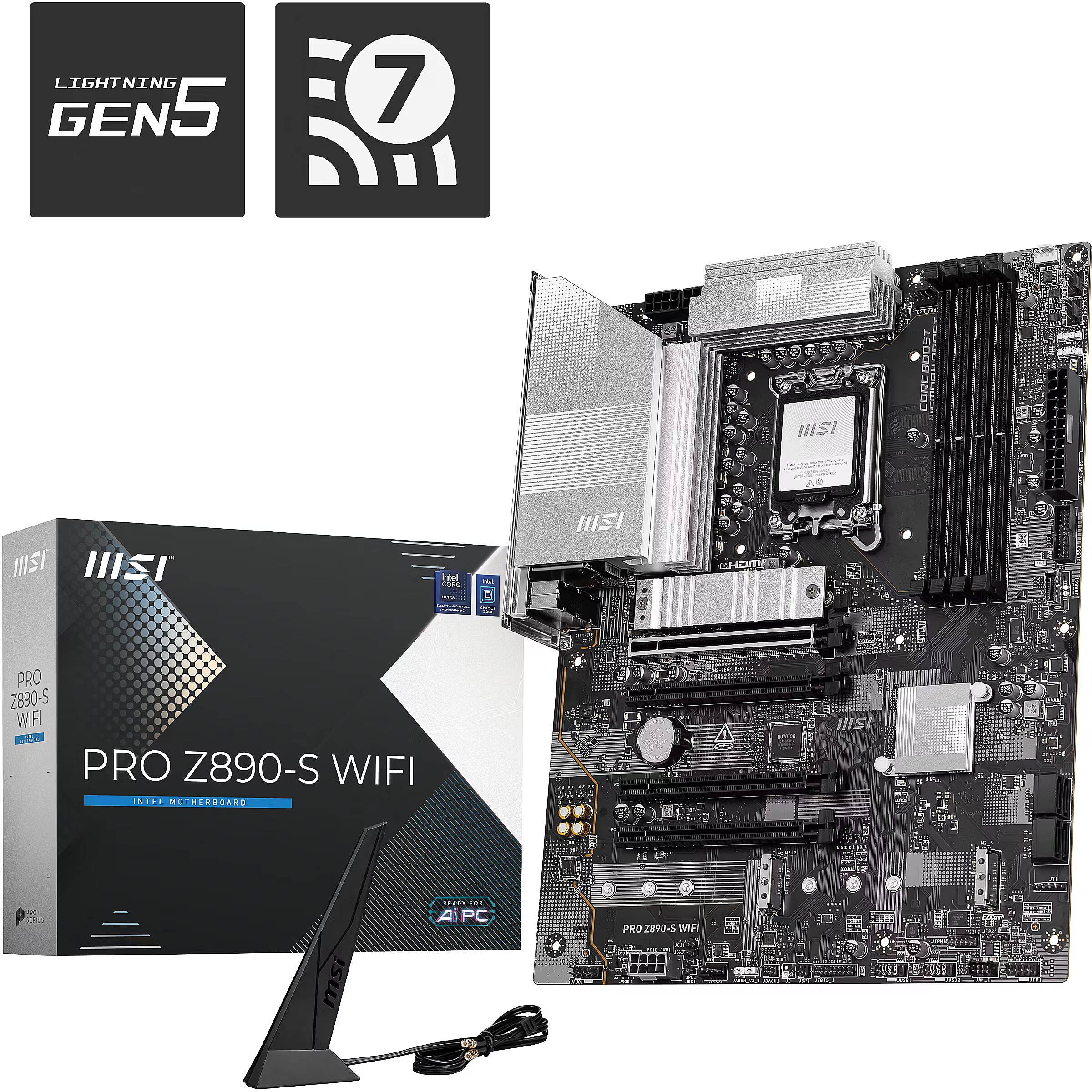 Description - PRO Z890-S WIFI Support Intel® Core™ Ultra Processors (Series 2) for LGA 1851 socket Supports DDR5 Memory, Dual Channel DDR5 8600+ MT/s (OC) Enhanced Power Design: 12+1+1+1 Duet Rail Power System with P-PAK , dual 8-pin CPU power connectors, Core Boost, Memory Boost, 6-layer PCB Frozr Guard: Extended Heatsink, MOSFET thermal pads rated for 7W/mK, additional choke thermal pads and M.2 Shield Frozr are built for high performance system and non-stop experience EZ DIY: EZ M.2 Clip II, EZ PCIe Clip II and EZ Antenna Lightning Fast Game experience: PCIe 5.0 slot, Lightning Gen 5 x4 M.2 Thunderbolt™ 4: brings Thunderbolt to USB-C at true 40 Gb/s speeds, 8K display support, Daisy-Chain, Multi-Port Accessory Architecture and USB 4.0 compliant 2.5G LAN with Intel Wi-Fi 7 Solution: upgraded network solution for professional and multimedia use, delivering secure, stable, and high-speed networking Audio Boost: Reward your ears with studio grade sound quality for the most immersive gaming experience