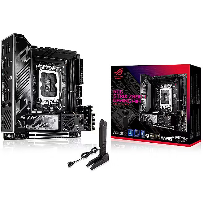 LongSummaryDescription - ASUS ROG STRIX Z890-I GAMING WIFI. Processor manufacturer: Intel, Processor socket: LGA 1851 (Socket V1), Compatible processor series: Intel Core Ultra (Series 2). Supported memory types: DDR5-SDRAM, Maximum internal memory: 96 GB, Memory slots type: DIMM. Supported storage drive interfaces: M.2, SATA III, Supported storage drive types: HDD & SSD, RAID levels: 0, 1. Ethernet interface type: 2.5 Gigabit Ethernet, Top Wi-Fi standard: Wi-Fi 7 (802.11be). Component for: PC, Motherboard form factor: mini ITX, Motherboard chipset family: Intel