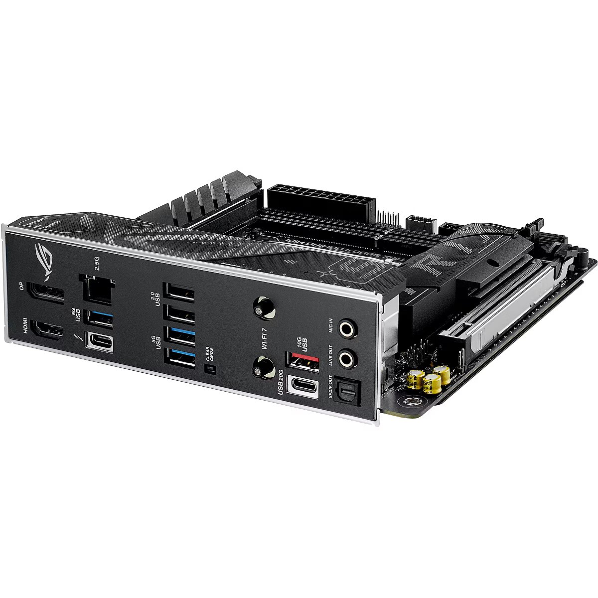 The ROG Strix B860-I features a sleek, minimalist design that blends effortlessly with various system components. Its deep black PCB and metallic heatsinks give it a bold, intense look, while the L-shaped backplate adds both style and practical protection against sharp edges.