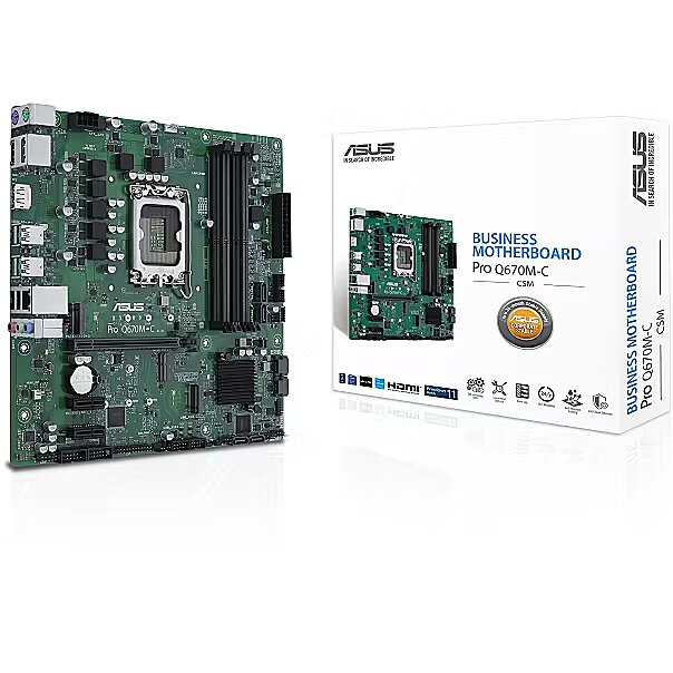 LongSummaryDescription - ASUS PRO Q670M-C-CSM. Processor manufacturer: Intel, Processor socket: LGA 1700, Compatible processor series: Intel® Celeron®, Intel® Core™ i3, Intel® Core™ i5, Intel® Core™ i7, Intel® Core™ i9, Intel Pentium G. Supported memory types: DDR5-SDRAM, Maximum internal memory: 128 GB, Memory slots type: DIMM. Supported storage drive interfaces: M.2, SATA III, Supported storage drive types: HDD & SSD, RAID levels: 0, 1, 5, 10. Ethernet interface type: Gigabit Ethernet. Component for: PC, Motherboard form factor: micro ATX, Motherboard chipset family: Intel