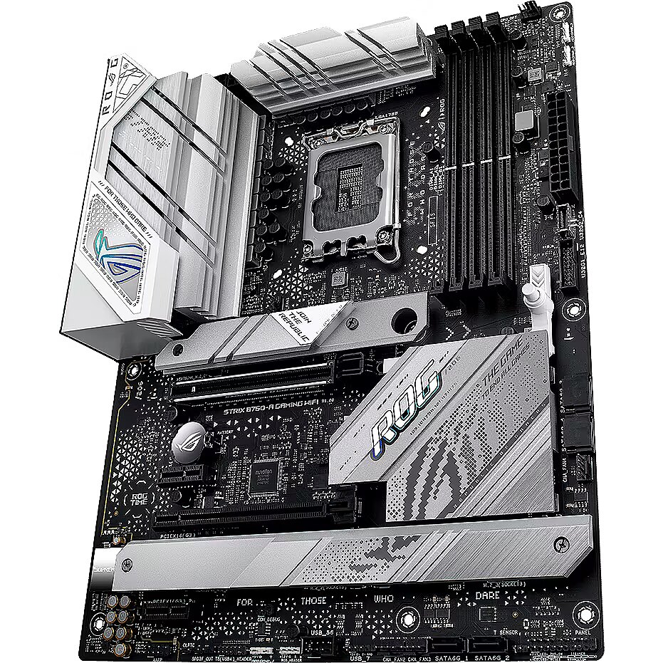 LongDesc - ROG STRIX B760-A GAMING WIFIJust like its formidable sibling, the ROG Strix B760-A Gaming WiFi dishes up a vibrant take on the latest Intel platform, with PCIE 5.0, USB 3.2 GEN 2x2, and cyber-inspired ROG motifs emblazoned on a high-contrast backdrop. But this variant features DDR5, bringing even more bandwidth to the table for games and apps.M.2 Q-LATCHThe innovative Q-Latch makes it easy to install or remove an SSD from an M.2 slot. The design employs a simple locking mechanism to secure the drive, eliminating the need for a traditional screw.ALL-ROUND PERFORMANCEThe neat aesthetics of the Strix B760-A were no distraction when crafting this motherboard’s power delivery and thermal arrays. You’ll get a fully fledged gaming experience and then some with this beast.VRM HEATSINK ARRAYCovering the power solution are two thick heatsinks with strategic airflow channels for increased heat dissipation while powering high-performance Intel 13th Gen processors.LEADING CONNECTIVITYThe Strix B760-A is entirely well-connected with high-speed wireless and wired networking, a plethora of USB I/O, and SupremeFX audio to pump crystal-clear sound through speakers or headphones for enhanced immersion.SUPREMEFXROG SupremeFX is a unique blend of hardware and software technologies that provide superior audio. The Strix B760-A implementation features the ALC4080 codec for high-resolution playback up to 32-bit/384 kHz across all channels. Front-panel output is streamed through the integrated Savitech amplifier that can drive high-fidelity acoustics to a wide variety of speakers and headsets.PLAY IN STYLEBold aesthetics and Aura Sync RGB controls let the ROG Strix B760-A shine in every build.UNDENIABLY ROG STRIXDiagonal slats, brushed aluminum, and bold RGB have become hallmarks of the ROG aesthetic, and the Strix B760-A bears all of them with pride. Its white, silver, and black color scheme pairs well with both dark and lighter-colored components. 8-bit accents show some gaming pride.SOFTWARE UTILITIESA myriad of ROG-exclusive tools put advanced system tuning and configuration at your fingertips.