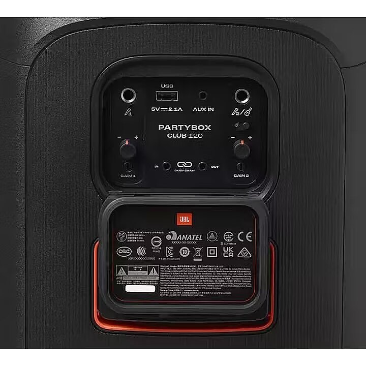 LongSummaryDescription - JBL PartyBox Club 120. Tweeter diameter (imperial): 5.71 cm (2.25"), Tweeter diameter: 5.7 cm, Woofer diameter (imperial): 13.3 cm (5.25"). RMS rated power: 160 W, Frequency range: 40 - 20000 Hz, Signal-to-Noise Ratio (SNR): 80 dB. Connectivity technology: Wired & Wireless, Frequency range: 2.4 - 2.4835 GHz, Bluetooth profiles: A2DP, AVRCP. Product type: Party speaker, Product colour: Black. Recommended usage: Universal, Audio formats supported: FLAC, MP3, WAV, WMA