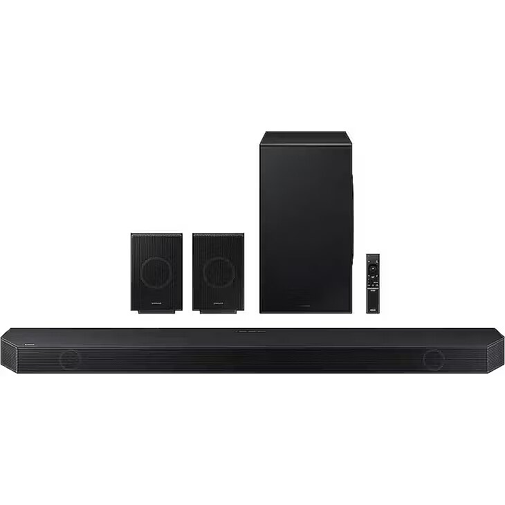 Description - Q-series 11.1.4 ch. Wireless Dolby ATMOS Soundbar + Rear Speakers w/ Q-Symphony / HW-Q990D Pair a Samsung TV with a Samsung Soundbar to unlock a new level of powerful audio. Experience content like never before with Q-Symphony.¹ Feel sound all around with 11 front-facing speakers, 1 subwoofer and 4 up-firing channels. Skip the HDMI cables and enjoy truly elevated audio with Wireless Dolby Atmos™. The Up/Side-Firing Rear Speakers use your ceiling and walls to create dense layers of all-around sound.