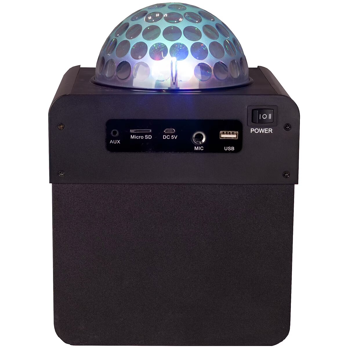 Technical details > Other features - Bluetooth Disco/Karaoke System; RGB LED Disco Ball that projects beautiful color patterns on the walls or ceiling; USB MP3 Playback; MicroSD Card MP3 Playback; Built-in Rechargeable battery up to 6 hours of playing time; Charging via Micro USB; Microphone