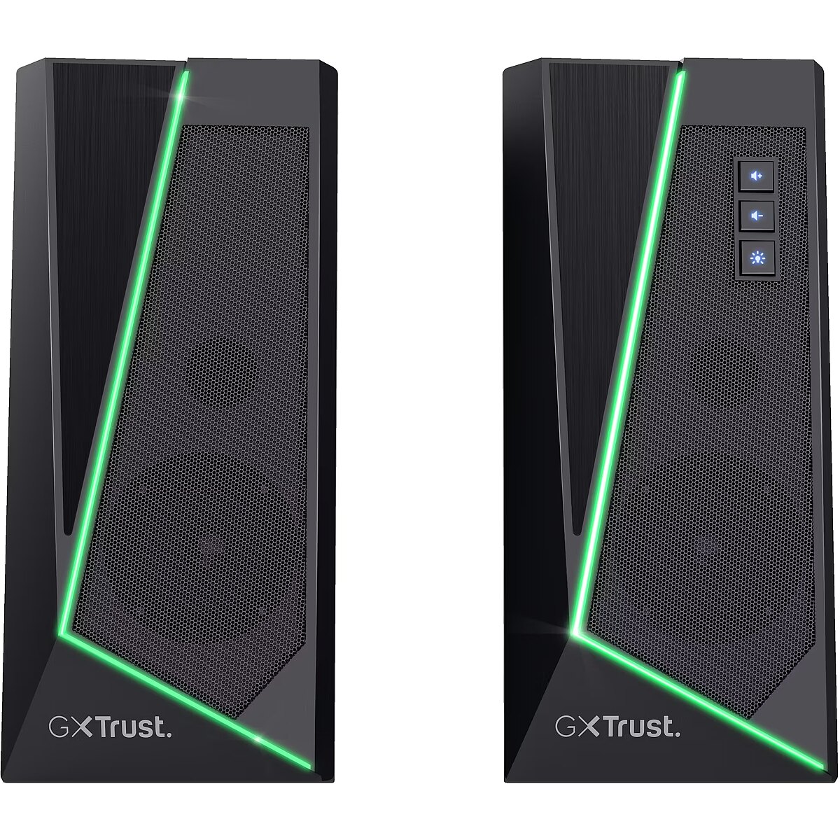 Description - GXT 609 Zoxa RGB Illuminated Speaker Set Stylish stereo speaker set with RGB Lighting and easy to reach controls Key features Stereo speakers with 12W peak power (6W RMS) Choose between 6 modes of RGB lighting Stylish, minimalistic design to fit modern desks Easy to reach volume control buttons and power button No wall plug needed; turns on automatically when switching on your PC