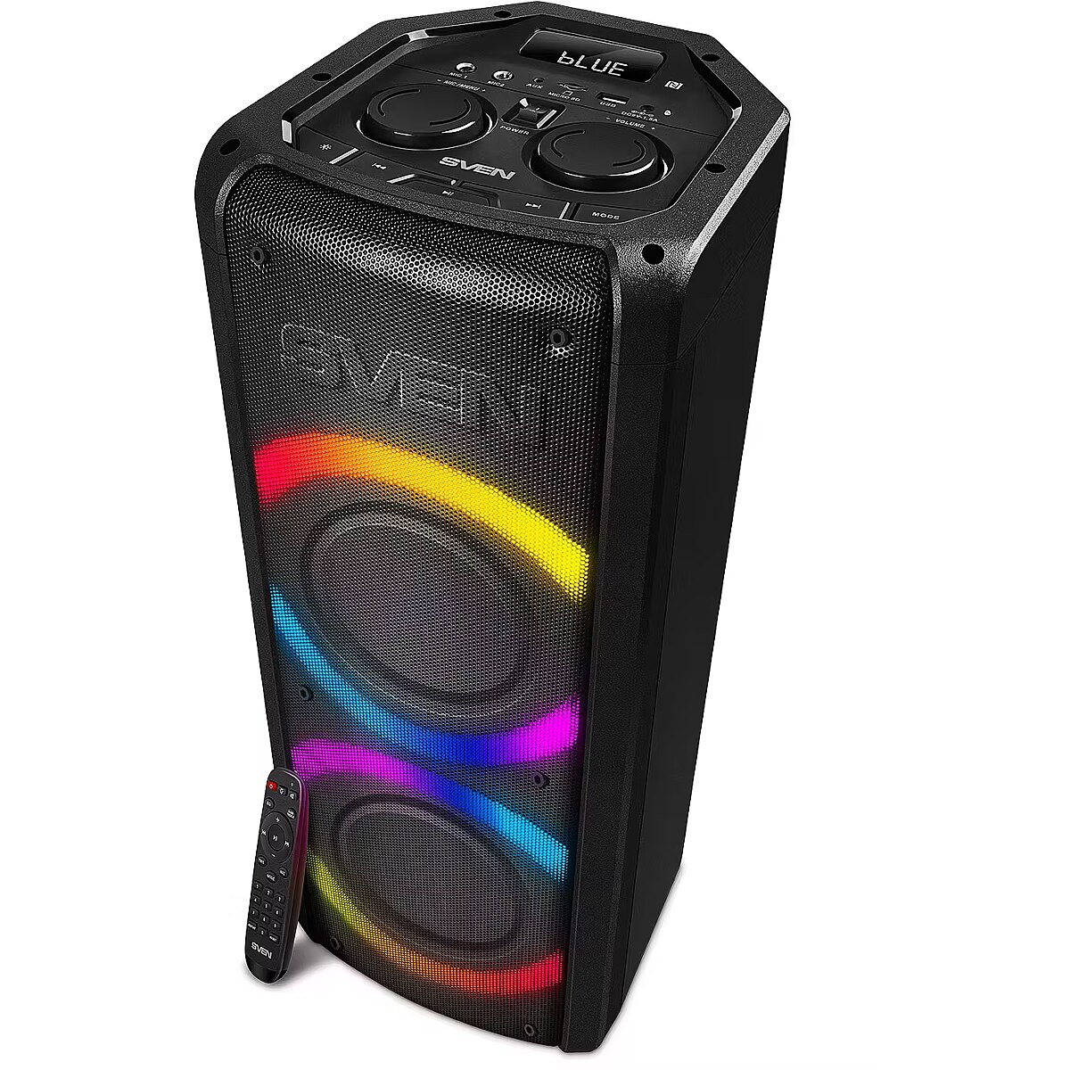 LargeDescHTML - INTERACTIVE LIGHT SHOW FOR A FUN PARTYMulticolor interactive backlight supports several operation modes. Bring the party to live, configuring the desired lighting design of music records! The backlight is visible even during the day, and in the dark it looks unbelievable!WIRELESS CONNECTION OF TWO SPEAKERS TO A SINGLE SOURCE (TWS)Connect two speakers using a wireless channel and create a stereo pair based on TWS technologies, and YOUR party will be legendary! Strong, broad format stereo sound and interactive illumination show will create unforgettable music images!KARAOKE PARTY AT YOUR HOME!Connect two mics to the speaker, in order to discover your singer's talents. Configure the desired sound level of your voice on the control panel. A light echo will add clarity and extra volume to vocals. Delight your close ones with live performance of your favorite tracks!WIRELESS SIGNAL TRANSMISSION VIA BLUETOOTHWireless sound transmission via Bluetooth will create a stable connection to the gadget at up to 10 m distance. It's not a problem to quickly turn on background music, listen to a podcast or audiobook — just "introduce" your smartphone to the acoustic system, and from then on the process will take a few seconds.YOUR FAVORITE TRACKS ON USB FLASH OR MICROSD CARDCollection of favorite tracks on USB flash or microSD memory cards is a great option for music lovers who have already made their choice. Stable playback of audio files without connecting additional devices!CONTROL PANEL WITH LED SCREENLED display provides information about radio station frequency, sound level, duration of a track when played back from USB/microSD. Control panel allows select audio input, configure backlight mode and manage a lot of other functions.REMOTE CONTROLSound level and a lot of different settings of the acoustic system can be configured using an easy-to-use remote control.EMBEDDED FM RECEIVERDon't have your collection of favorite tracks close at hand? No worries! Embedded FM radio allowing to select radio frequency on LED screen will offer great variety of tracks 24/7, helping create a perfect atmosphere with a variety of melodies around the clock.. A cable that connects to AUX socket can serve as an antenna.WIRED CONNECTIVITY TO AN AUDIO SOURCEFor a wired connection of the speaker to transmitting devices, the delivery set includes an appropriate audio cable. Cable connection ensures maximum quality and stable connectivity, supporting complete and effective usage of acoustic resources of the device.TWO POSITIONS FOR A GREAT SOUNDIn vertical position the speaker takes minimum space, and in horizontal position allows to achieve a vivid stereo effect. You can select any position, because the legs are located on the bottom and on the side wall of a speaker.SMARTPHONE WHERE IT'S NEEDEDOn a top panel there is a smartphone stand, helping conveniently locate the gadget, ensuring its steadiness and security.RELIABLE WHOLE HANDLE FOR CARRYING AROUNDA convenient and durable handle for carrying around gives integrity to a dynamic image of a speaker.QUICK CONNECTION VIA BLUETOOTH USING NFCNFC technology allows to synchronize your device with a speaker in a single tap and automatically connect it in a moment, and after that you can immediately start listening to your favorite content.