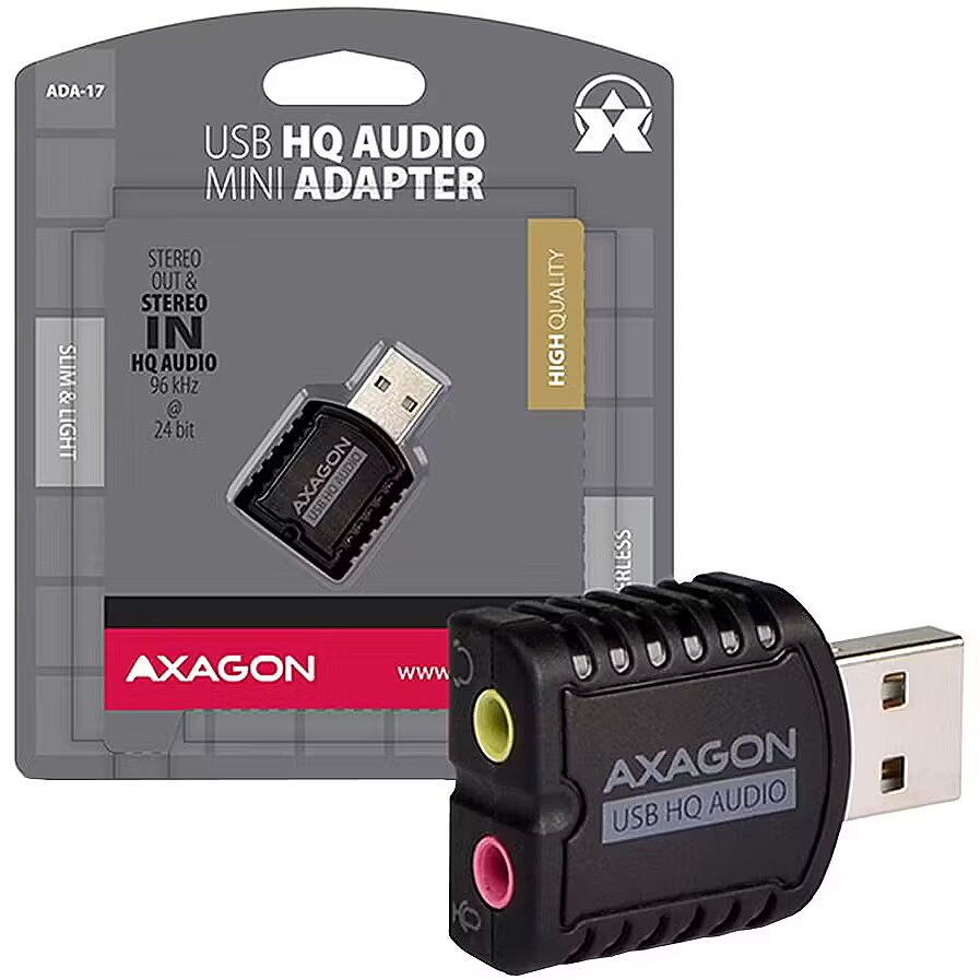 Description - ADA-17 USB - HQ MINI audio Miniature USB sound card with a high-quality sound and stereo input. The AXAGON ADA-17 MINI USB HQ audio adapter easily and quickly adds an external USB sound card to your computer. The miniature sound card is suitable for both desktop and laptop computers and allows stereo headphones, microphones or headsets to be connected for Skype, Zoom, MS Teams services etc. It also serves well as a replacement for the broken original sound card in your notebook and replace headphones output or microphone input. The advantage of the ADA-17 USB DAC converter is, however, the high-quality 24-bit audio with up to 96 kHz sampling in playback. The installation can be handled by everyone - only plug the adapter into the USB port of the computer and the rest is done automatically.
