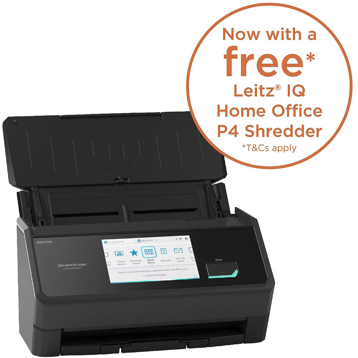 LongDesc - Offering total flexibility and convenience for modern home and office work, the iX2500 fits how and where you work. The Quick Menu offers instant ad-hoc scanning, while customised buttons can be easily created for recurring tasks – matching your own scanning preferences and habits. What’s more, usable scanned data can be instantly recognised and activated as a working link – enabling you to click directly on numbers or addresses to make phone calls or send emails in an instant.The gateway to digitising your life and working smarterIts small footprint also means the iX2500 can conveniently fit into many more desktop spaces than alternatives in the market. The iX2500 is also intuitively designed for an easy, effortless user experience. The 5-inch capacitive LCD touch screen offers popular ScanSnap design elements such as one-touch scanning directly from the unit, while its rapid 45 page per minute double-sided scanning speed and 100 sheet chute capacity mean you will breeze through your scanning tasks in no time. There’s plenty of personal productivity packed into our most versatile scanner yet, enabling simple digitisation of your documents and data, how you want, wherever you want.Smart data recognitionYour usable scanned data can be instantly recognised and activated as a working link – enabling you to click on numbers or addresses to make phone calls or send emails in an instant. No copy/paste necessary.Tailored to your scanning habitsMade to match your needs, the iX2500 features a Quick Menu for ad-hoc scanning while also enabling you to easily create customised buttons for recurring scanning tasks.Takes up less space while you scanThe iX2500 has an in-use footprint of only 477mm x 292mm. Significantly smaller than alternative productsIntuitive design for a quick and easy user experienceThe iX2500 features a 5-inch capacitive LCD screen with popular ScanSnap design elements including one touch scan for a simple scanning process.Scans quickly – saving you time and effortTo speed up the process even further, the iX2500 can hold up to 100 sheets and scan up to 45 double sided pages per minute.Software solutions that can assist with photo processing:• "PFU Clear Image Capture" – This feature is directly integrated into the iX2500 scanner.• ScanSnap Home – This software must be downloaded separately, but it offers additional features for photo scanning, including:- Automatic image enhancement- Color restoration of faded photos- Red-eye correction- Automatic image rotation
