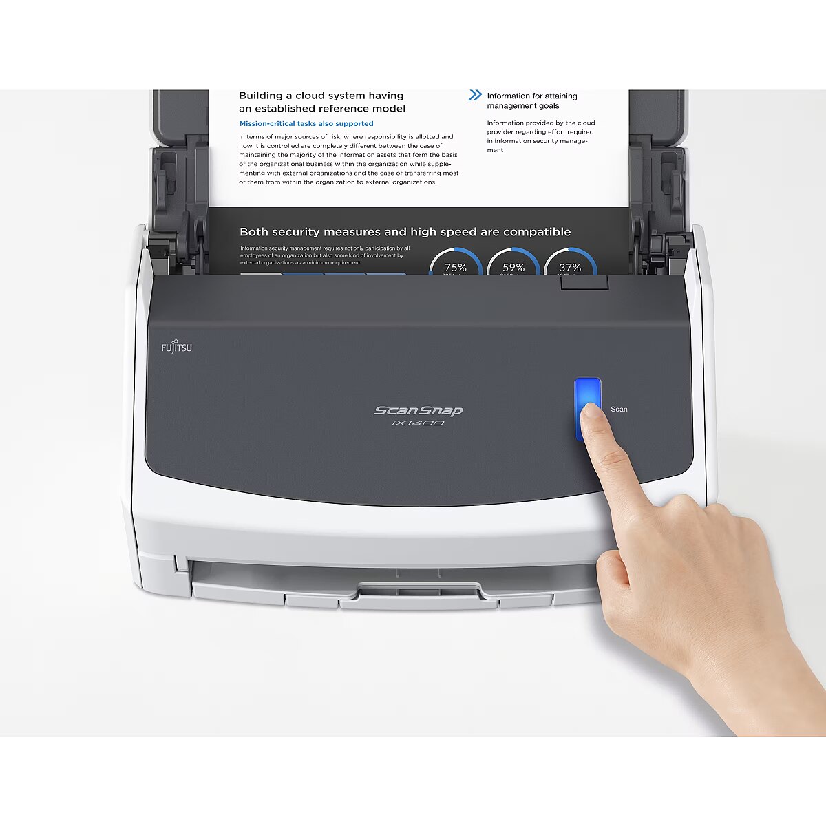 LongDesc - For individuals and IT novices, the beautifully simple iX1400 can digitise, process and organise all your documents from one easy device. You don’t need to know IT. You just need to press the blue button.Just press the blue buttonPaperwork is a necessary part of life. But does it have to be so much work? The ScanSnap iX1400 offers advanced, yet refreshingly simple technology that anyone can use. Its one-touch scanning is the smarter way to work for busy individuals, turning time-consuming chores into simple tasks at the push of a button. Just scan, save, and share – it’s that easy.With no complex settings to configure, the iX1400 will be up and running from the box in record time. While the Quick Menu function lets you instantly create the type of file you want, whether it’s a searchable PDF, editable Word, Excel or PowerPoint, or extracting data from receipts and business cards.